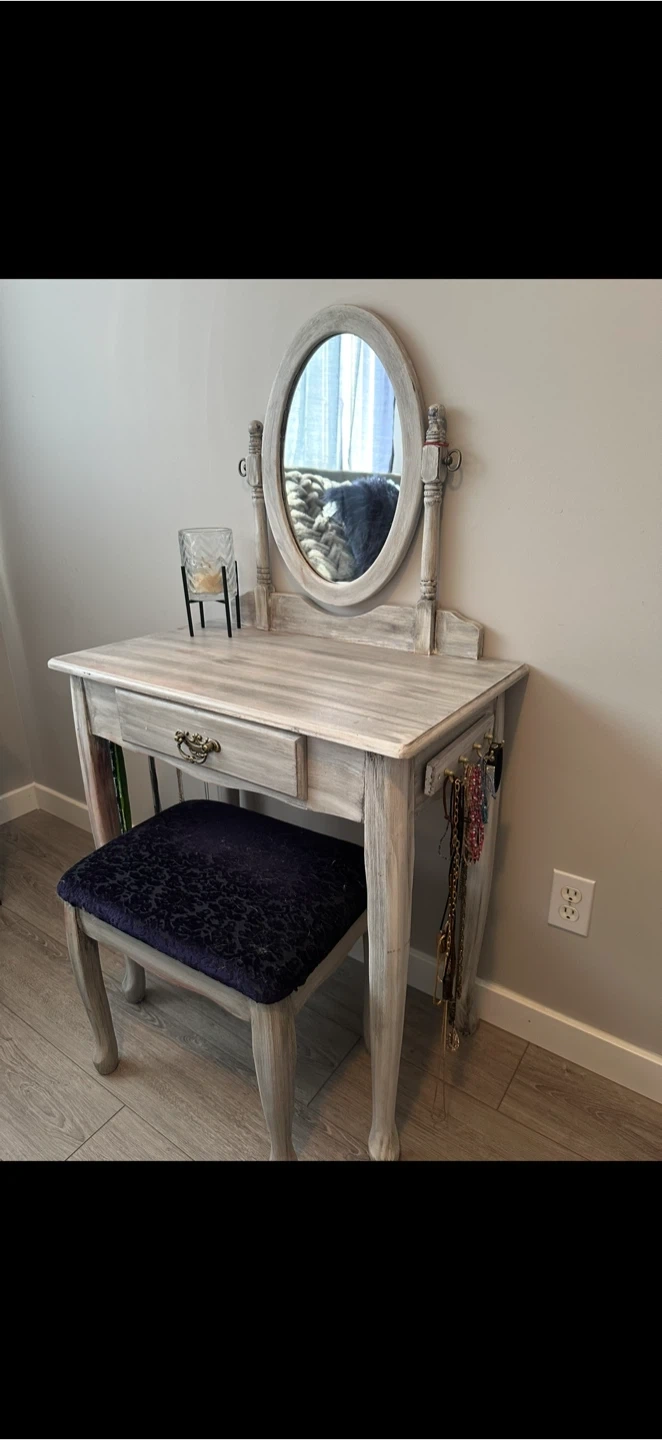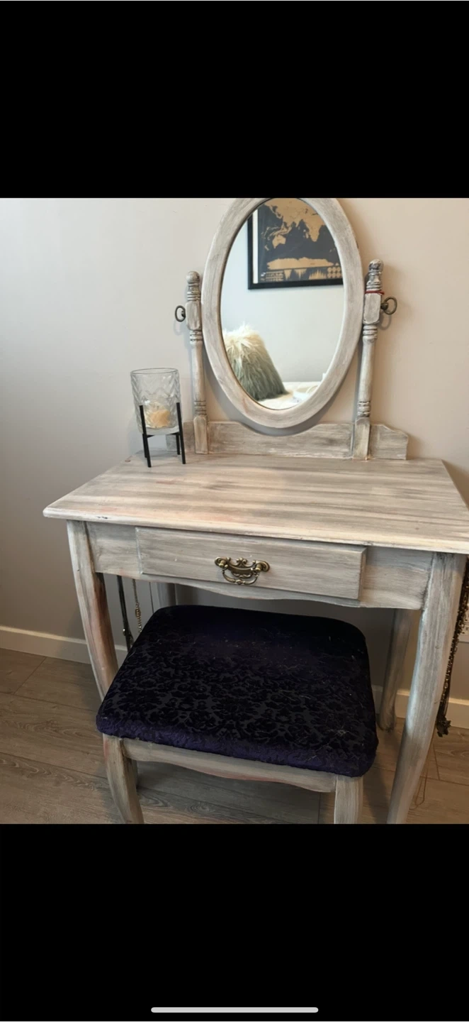 Selling a vanity table with a stool. It has a lovely oval mirror and a drawer for storage. The stool has a comfy, patterned cushion. Perfect for a bedroom or dressing area!