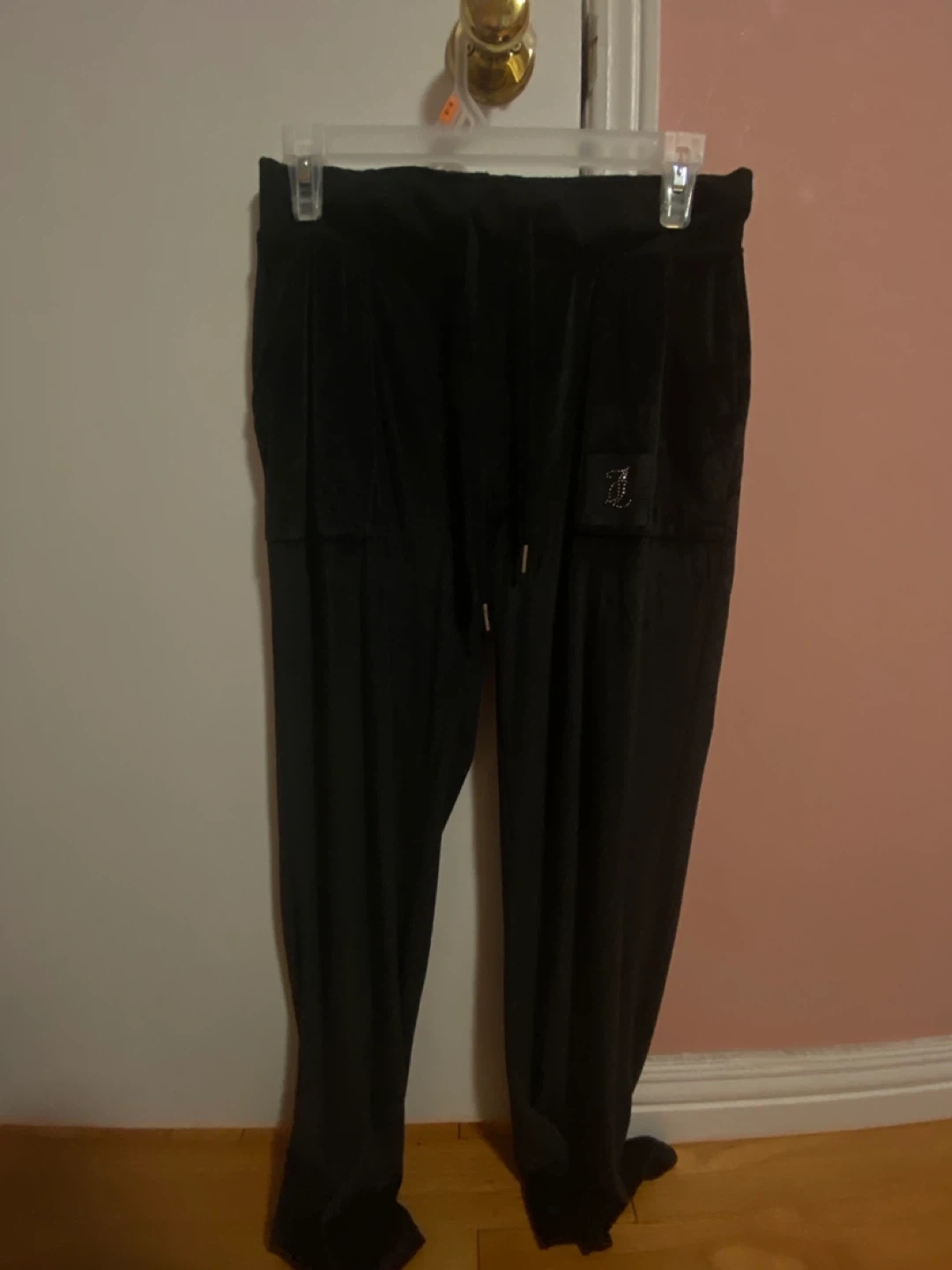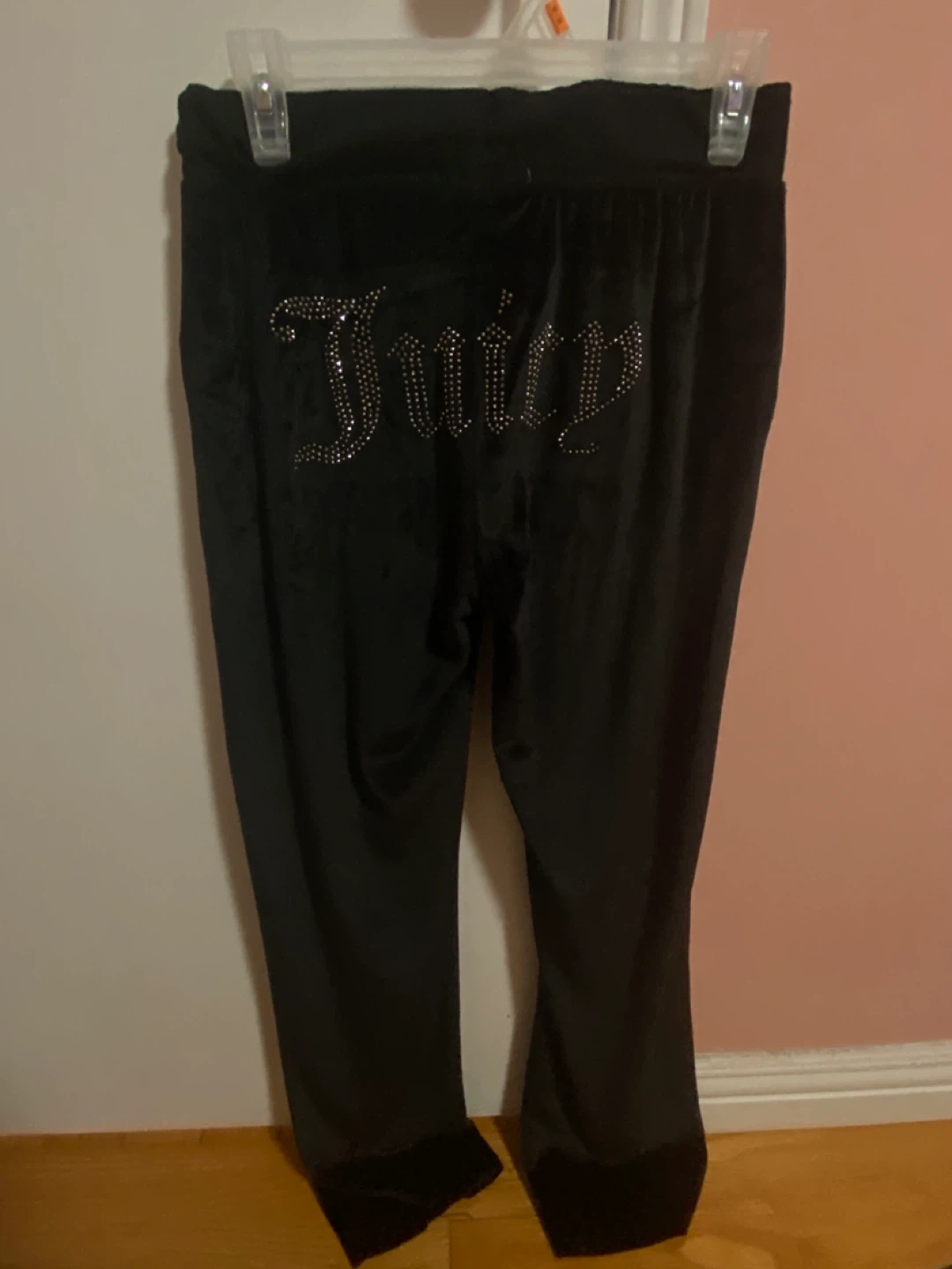 Black velour track pants by Juicy Couture. Features the iconic "Juicy" logo embellished with rhinestones on the back. Soft velour material.