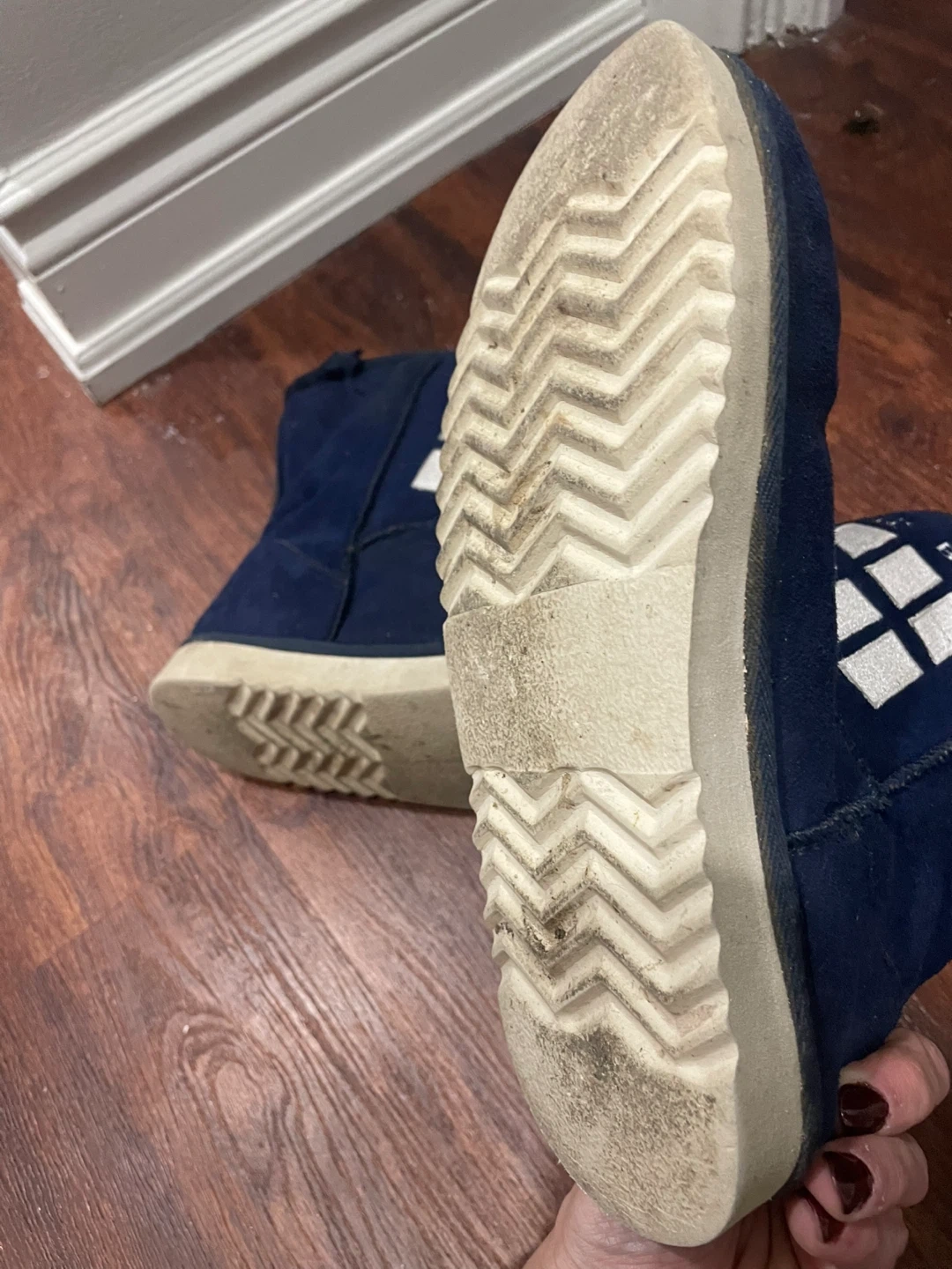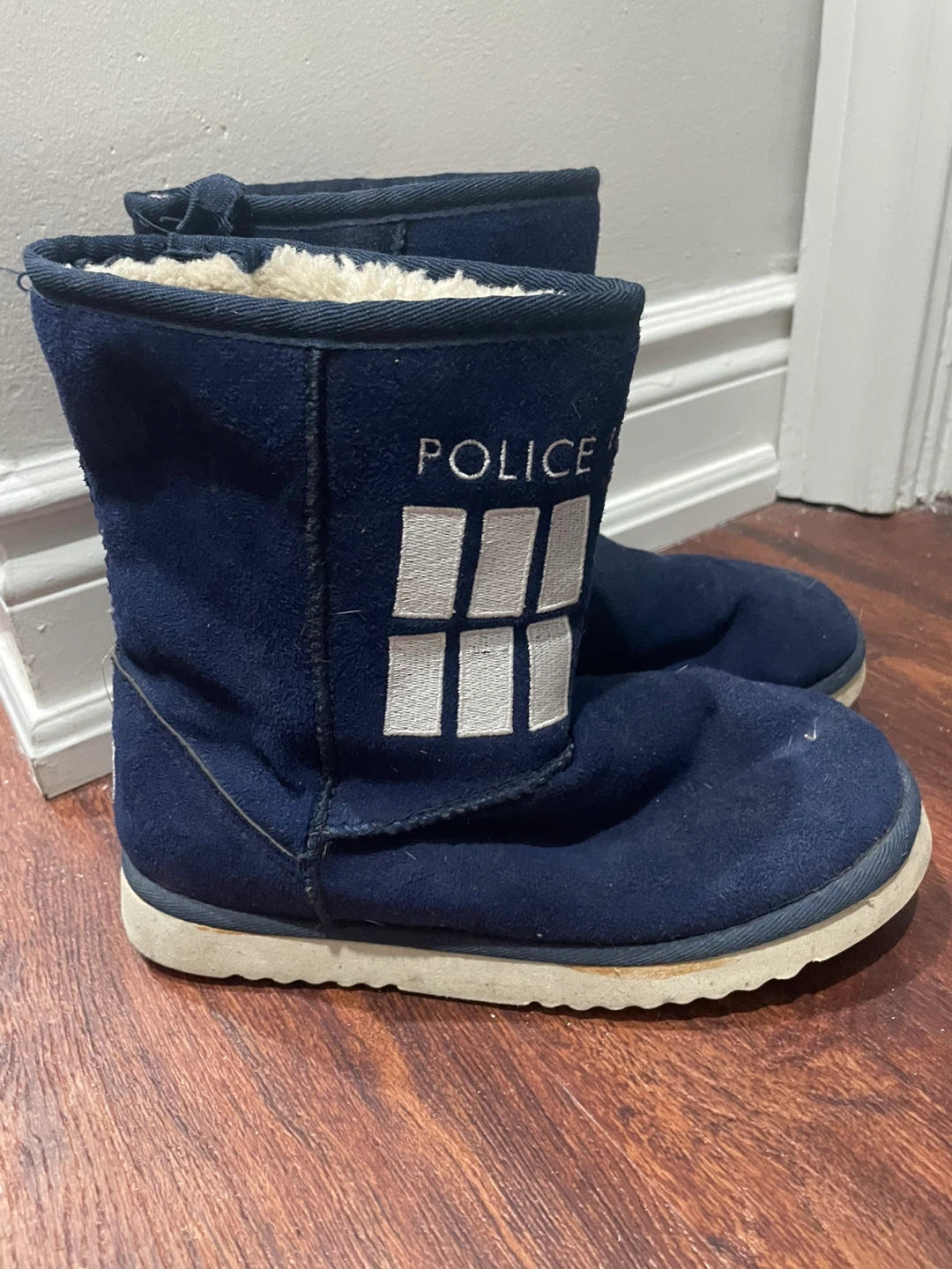 Cozy Doctor Who slippers designed like the TARDIS Police Box. These are a ladies size 7 with a soft, fuzzy lining. They're perfect for any Doctor Who fan who wants to keep their feet warm!