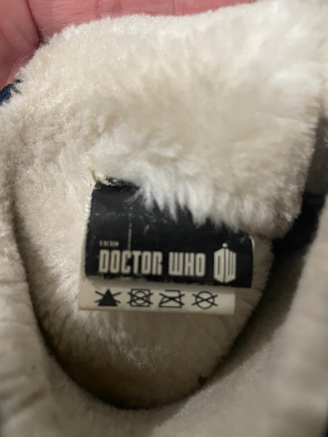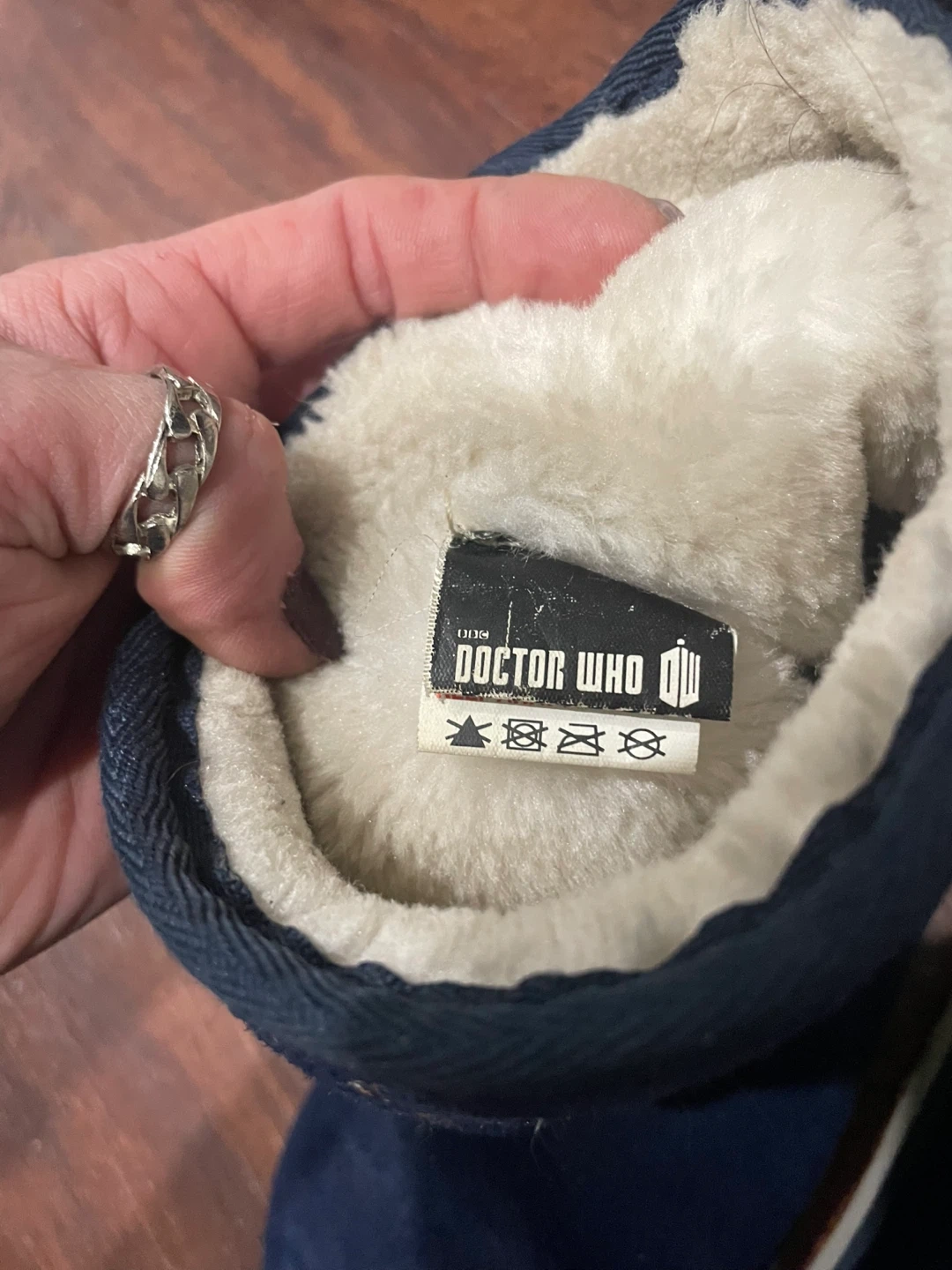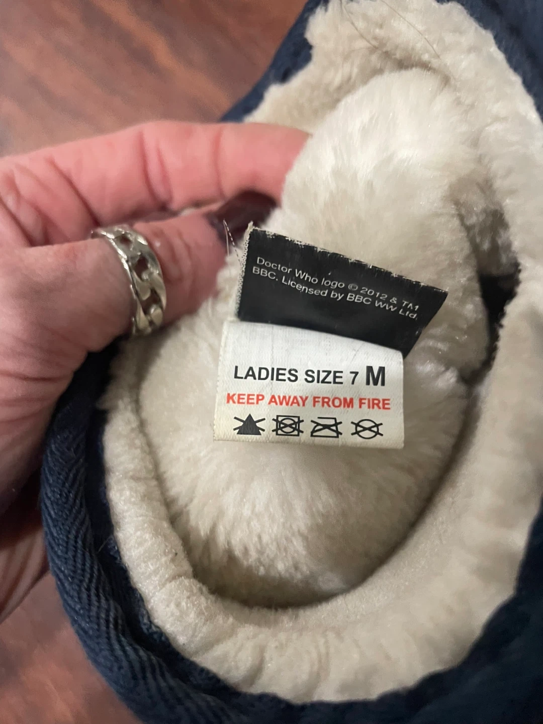 Cozy Doctor Who slippers designed like the TARDIS Police Box. These are a ladies size 7 with a soft, fuzzy lining. They're perfect for any Doctor Who fan who wants to keep their feet warm!