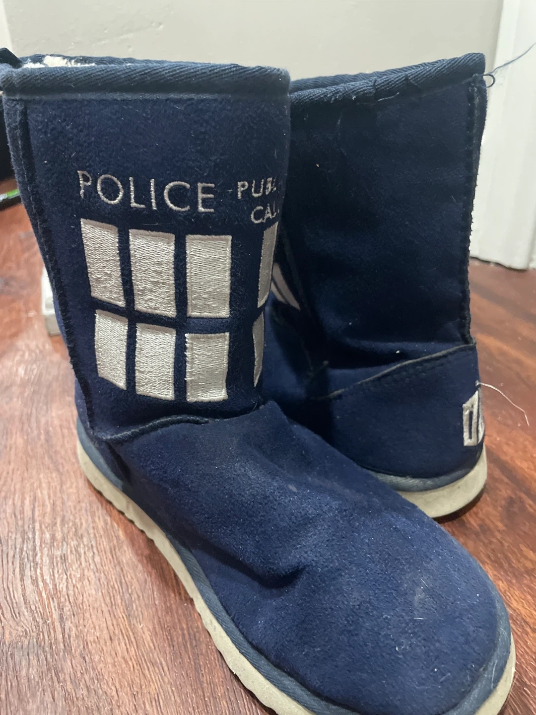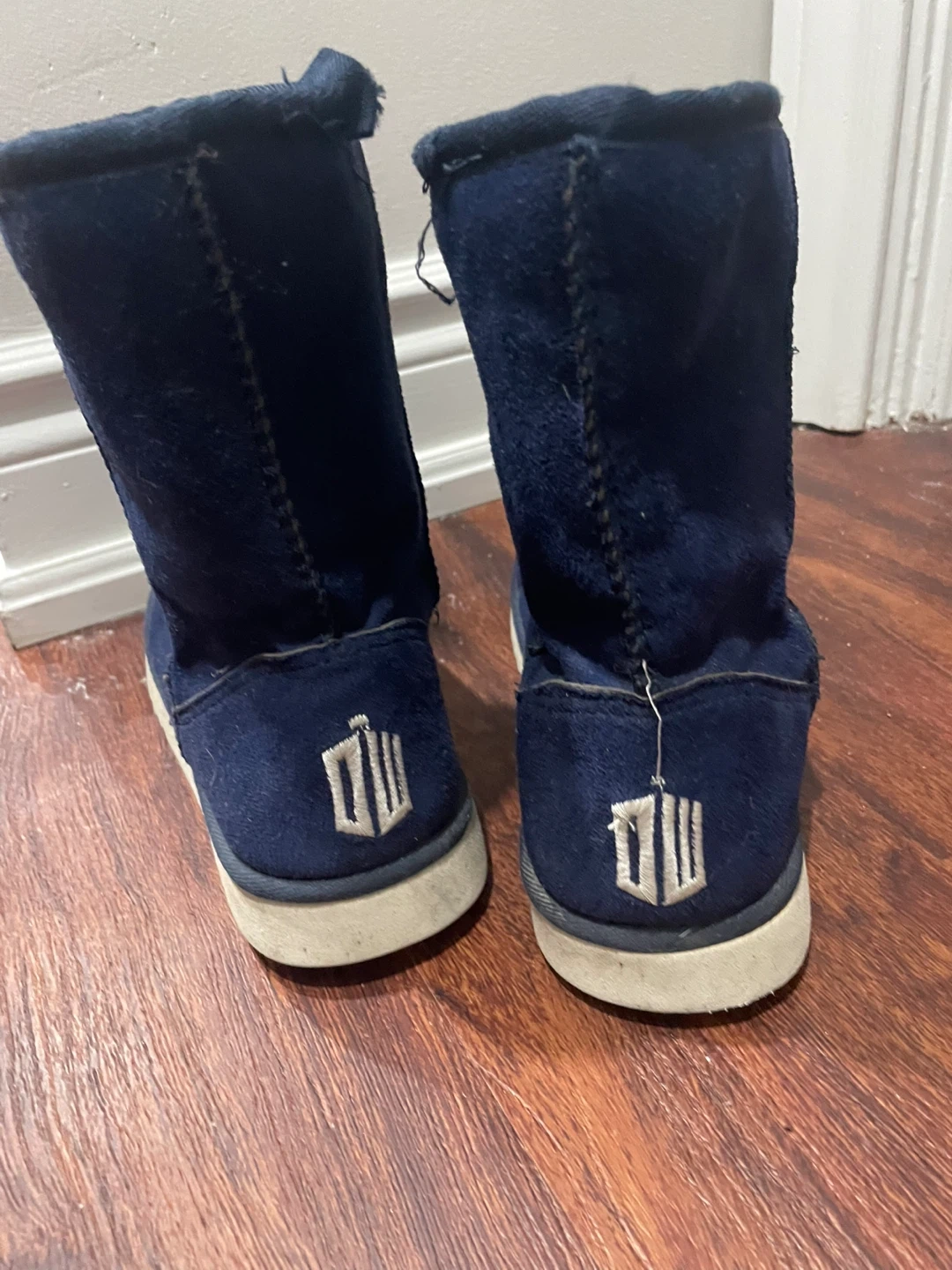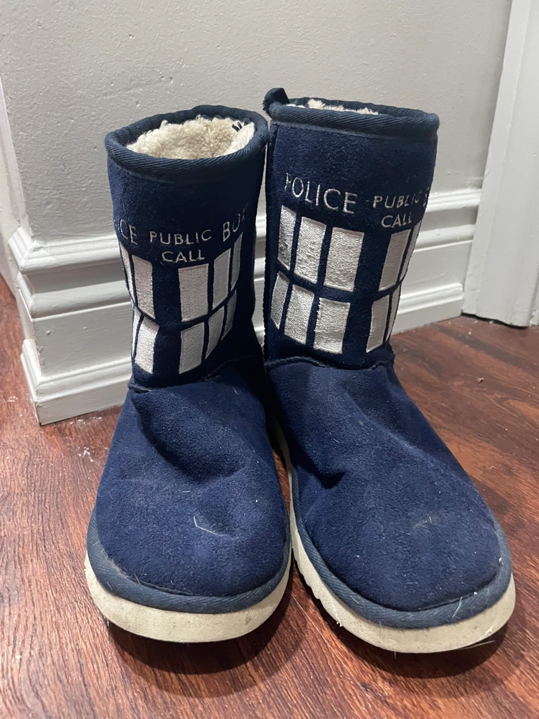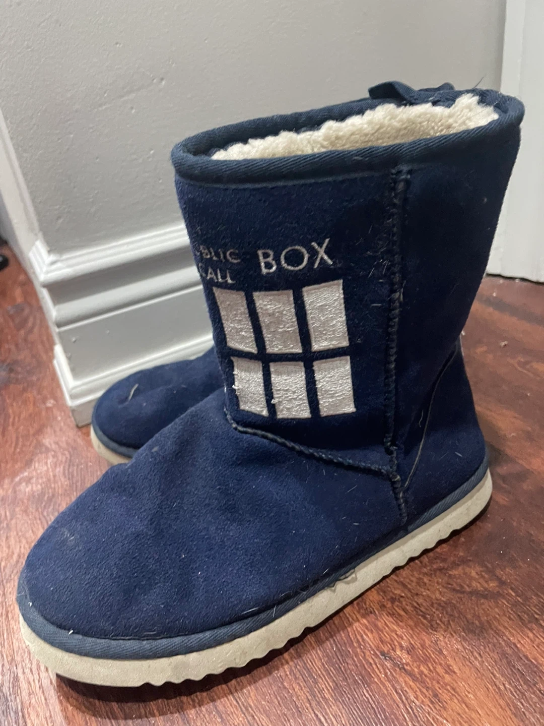 Cozy Doctor Who slippers designed like the TARDIS Police Box. These are a ladies size 7 with a soft, fuzzy lining. They're perfect for any Doctor Who fan who wants to keep their feet warm!