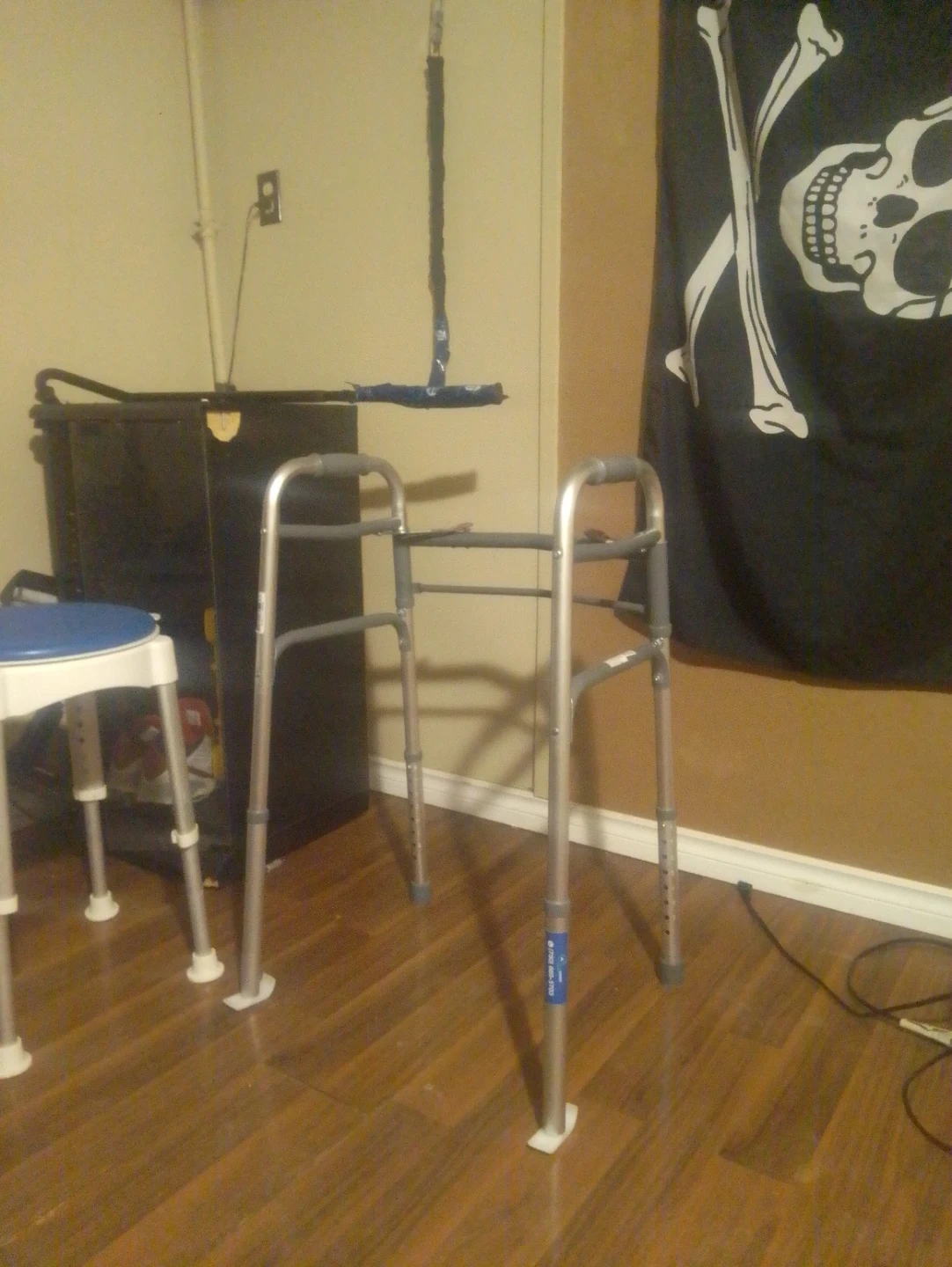 This is a standard adjustable folding walker, made of lightweight aluminum. It features a T-bar design for easy grip and adjustable height settings. Folds flat for convenient storage and transport. Great for mobility assistance!