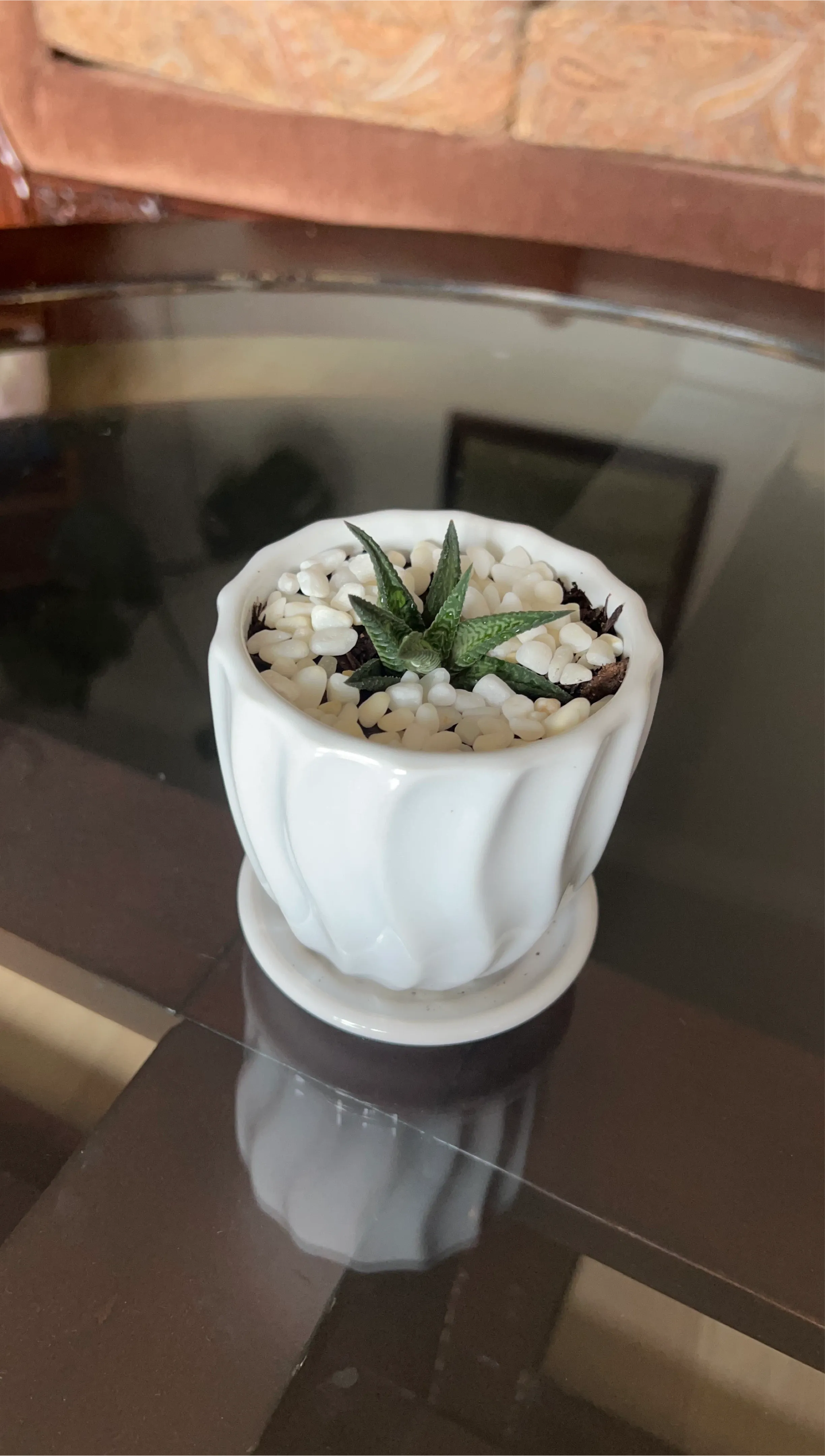A small succulent plant sits in a white ribbed ceramic pot with a matching saucer. The pot is filled with decorative white stones and soil. It's a lovely addition to any indoor space.