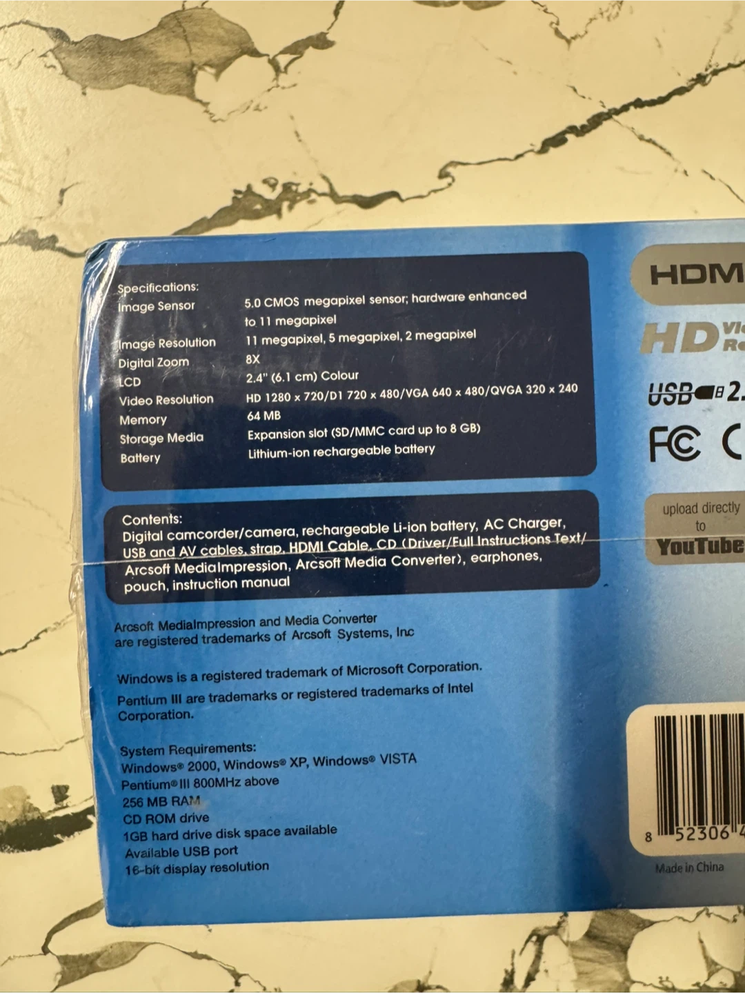 This is a Hi-Definition Video Camera with 11 Mega Pixels. It has H.264 high quality video recording and an 11-megapixel enhanced still image resolution. It also features an 8x digital zoom and a 2.4" LCD screen.