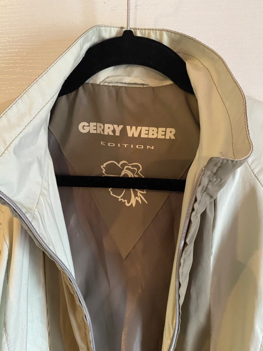 This is a beige rain jacket from Gerry Weber Edition. It is in great condition and ready for a new home. Perfect for those rainy days!