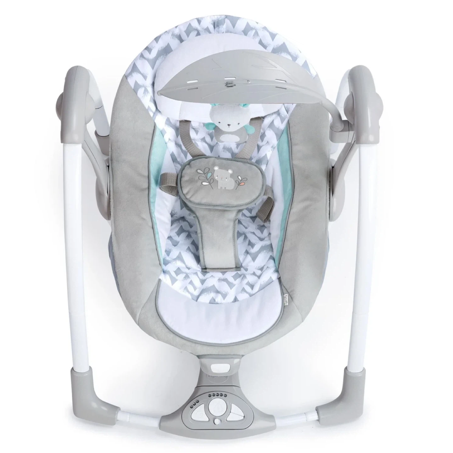 This Ingenuity baby swing has a soft grey and white patterned seat. It includes a mobile with a plush bunny toy. The swing has various controls on its base for speed and music.