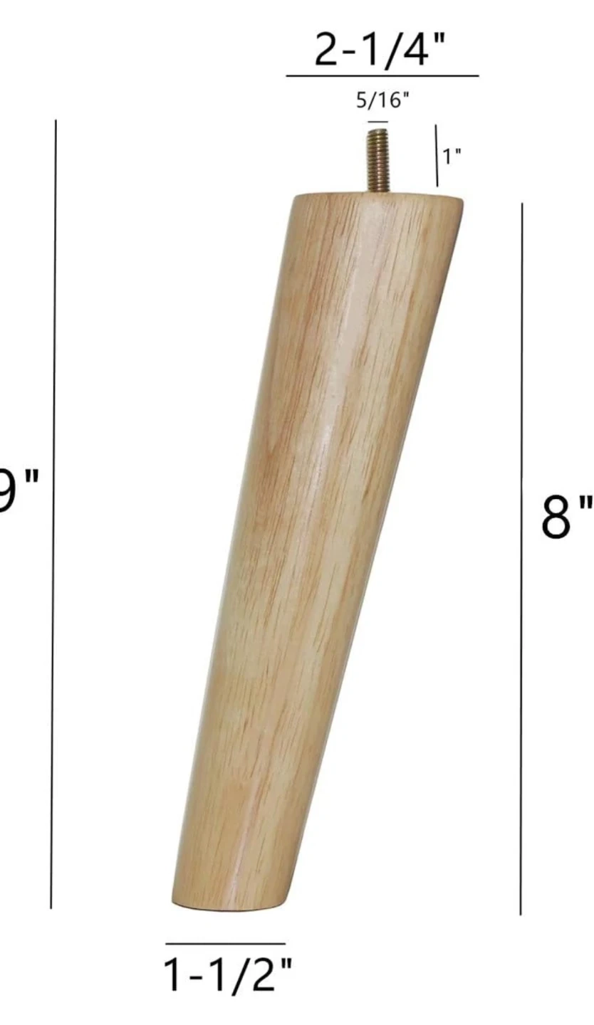 Set of four WEICHUAN solid wood furniture legs. Each leg is 8 inches long with a 2-1/4 inch top diameter. Includes mounting plates, screws, and protective pads for easy installation. Perfect for upgrading sofas, chairs, or cabinets!