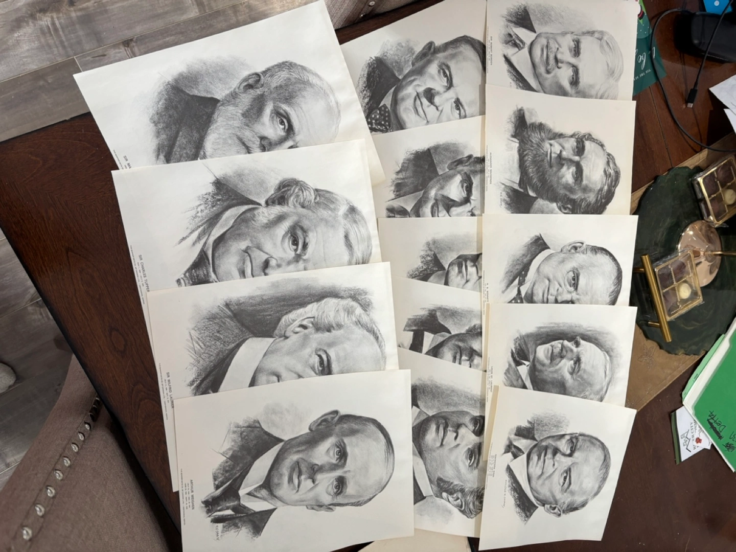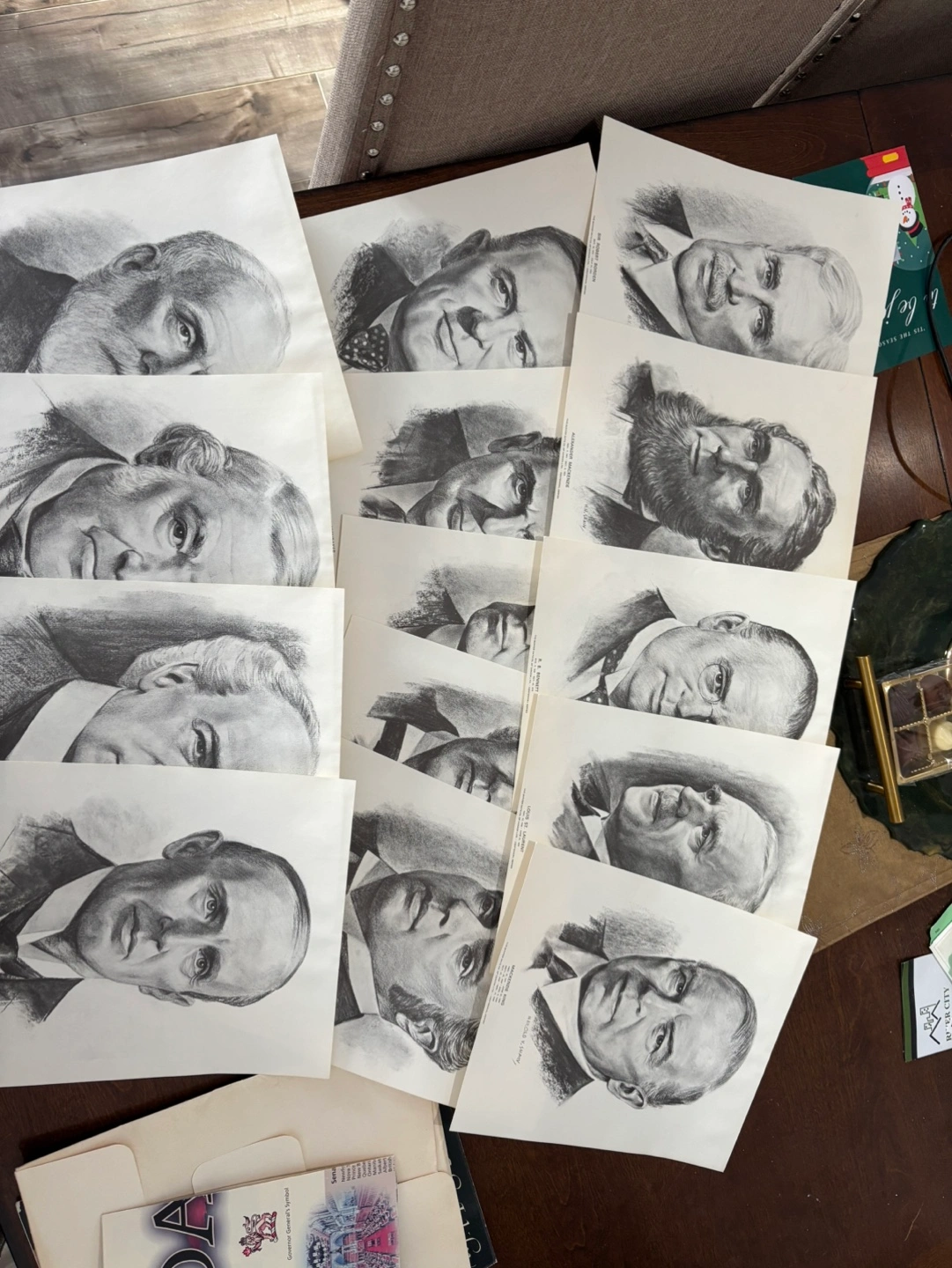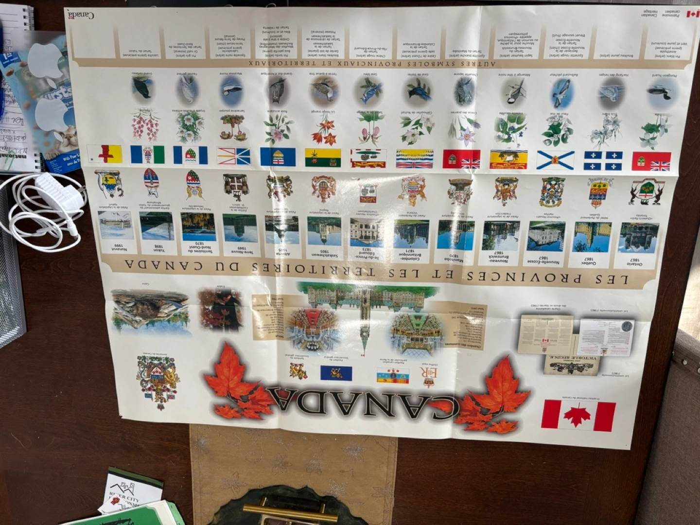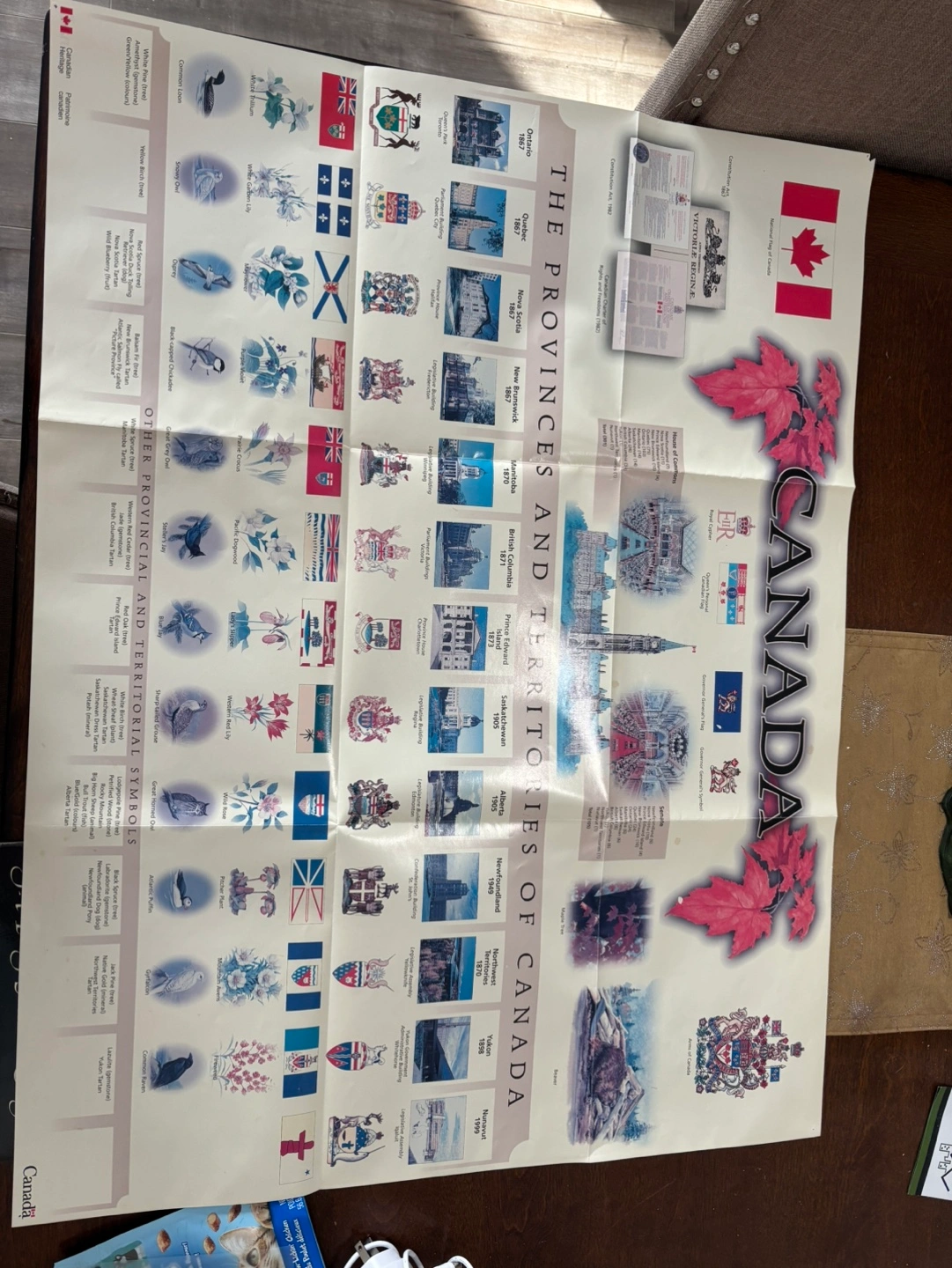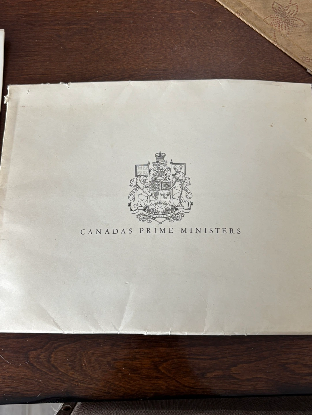 Collection of 8x10 vintage prints featuring portraits of Canada's Prime Ministers. Includes a large fold-out chart showcasing provincial and territorial symbols, flags, and emblems. French and English ! Great for history buffs or Canadian collectors.