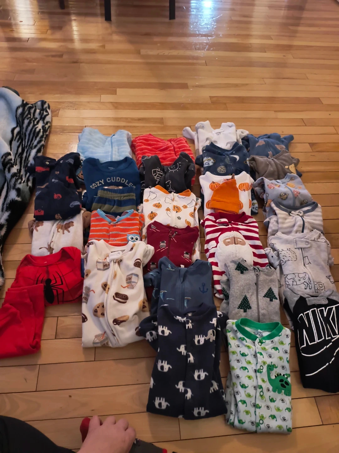 Bundle of baby clothing featuring Nike outfits including two hoodies, two t-shirts, and two pairs of pants. Also includes a variety of sleepers and onesies with different patterns and characters. Sizes vary, mostly for infants.