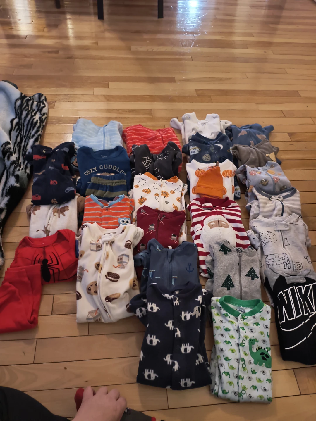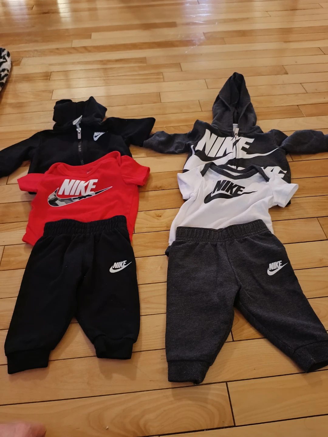Bundle of baby clothing featuring Nike outfits including two hoodies, two t-shirts, and two pairs of pants. Also includes a variety of sleepers and onesies with different patterns and characters. Sizes vary, mostly for infants.