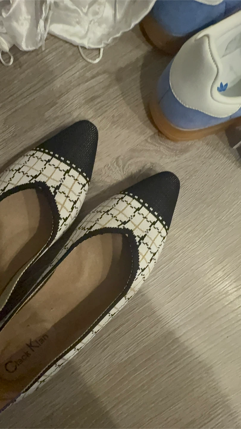 Selling a pair of Clack Klan women's flats in size 40. Only tried on indoor, too big for me. there’s a darkened spot at the insole because I tried to put a self-adhesive insole to make it smaller..didn’t work. The shoes have a unique checkered design with a black toe cap. Super comfy (same as vivaia) and classic for office or casual day out. I am a size 7.5 in most brands (Tory, RV, Sam Edelman, JC,etc) 8 in Steve Madden, this pair fits US 8.5 to 9.