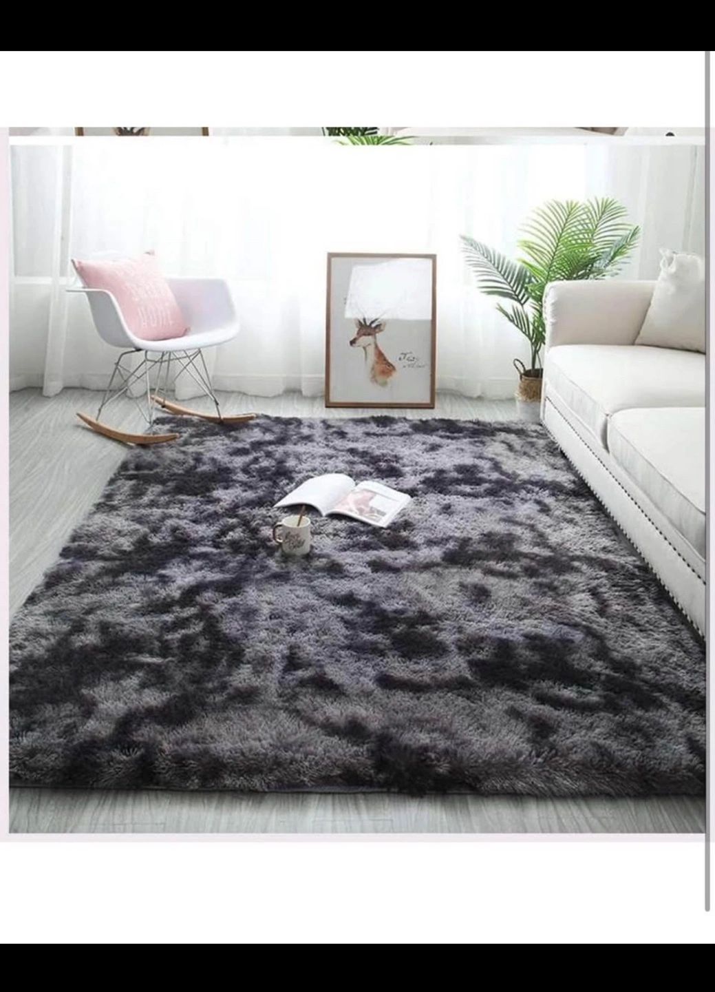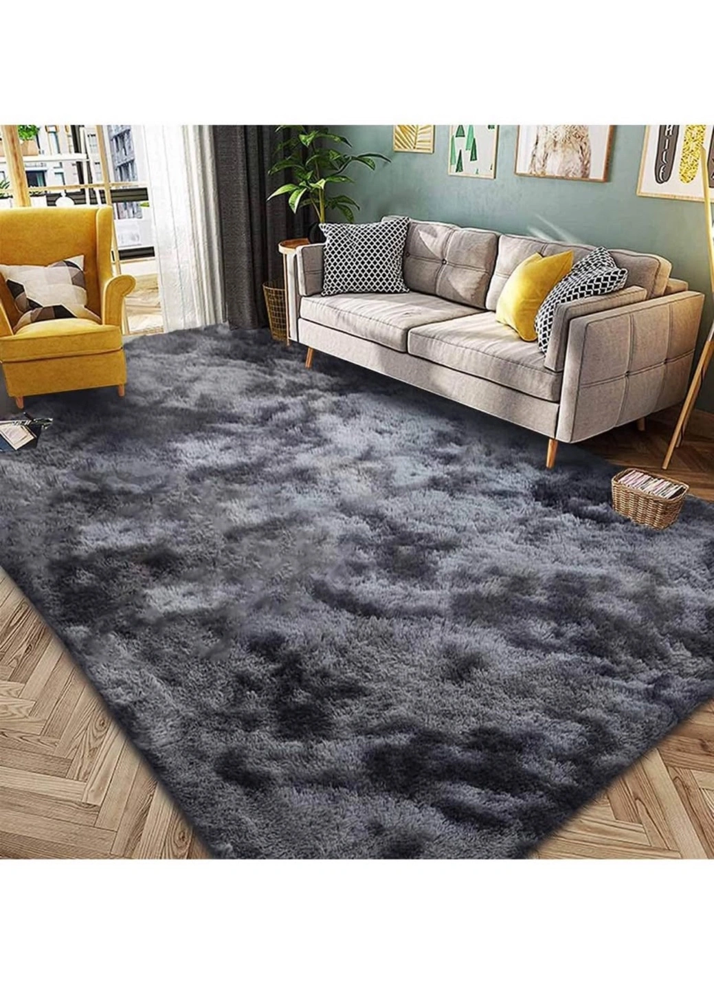 Large grey rug. Soft, fluffy texture. Great for living room or bedroom. Adds a touch of cozy style to any space. Machine washable.