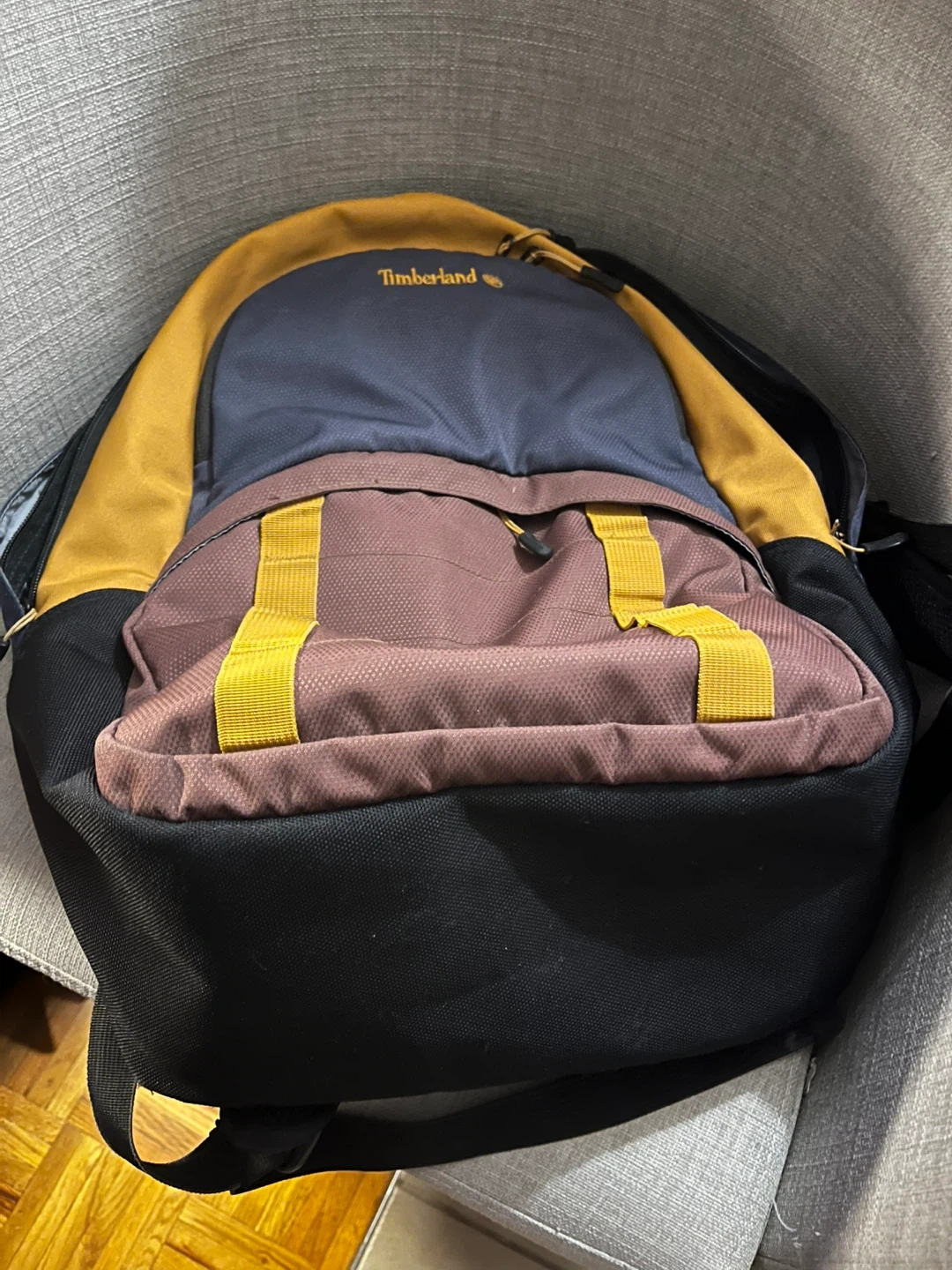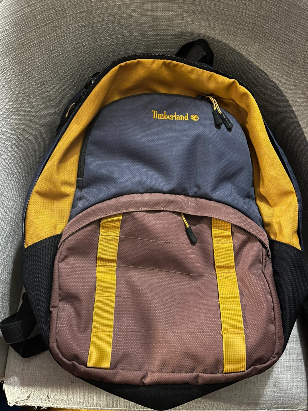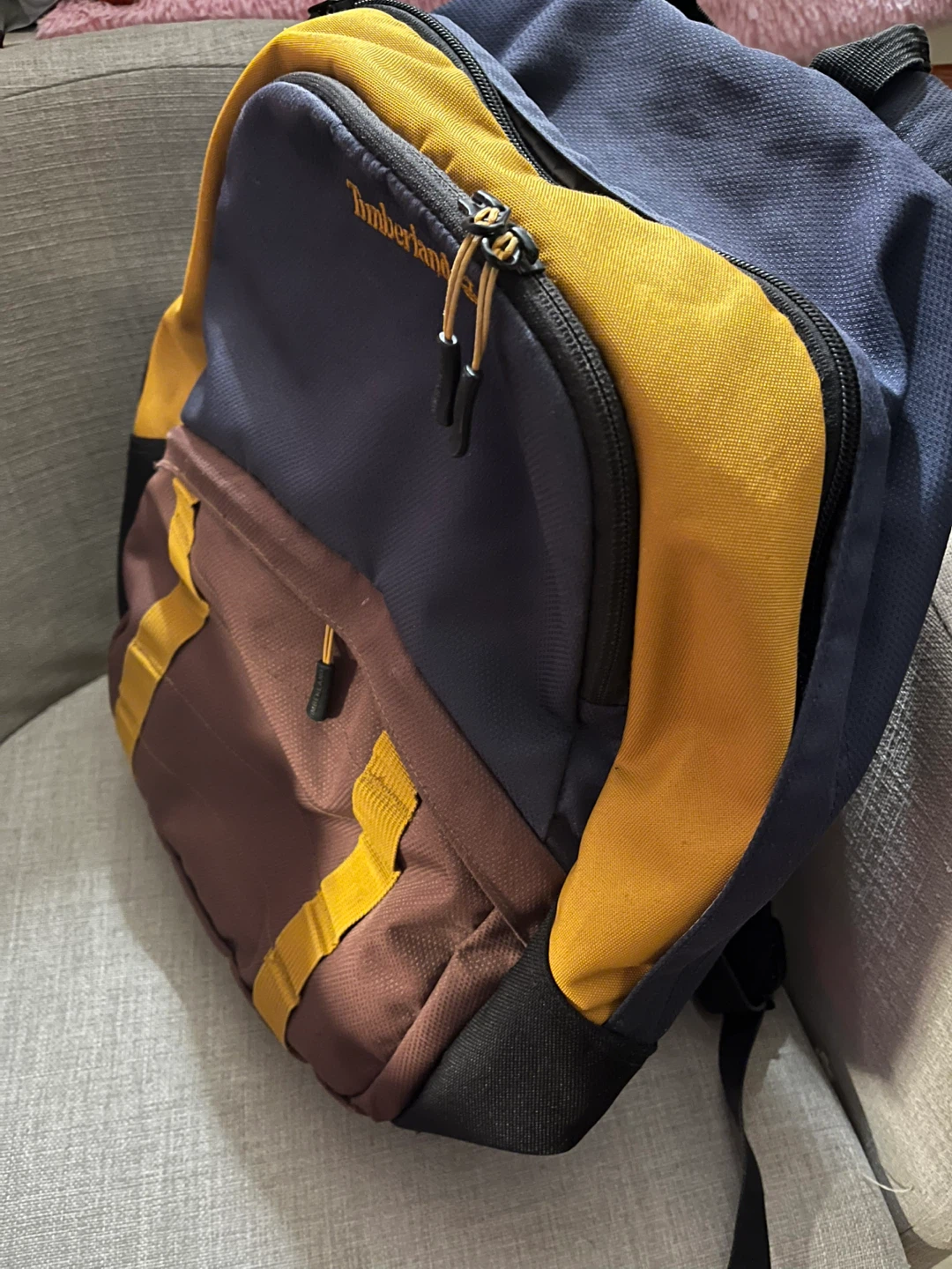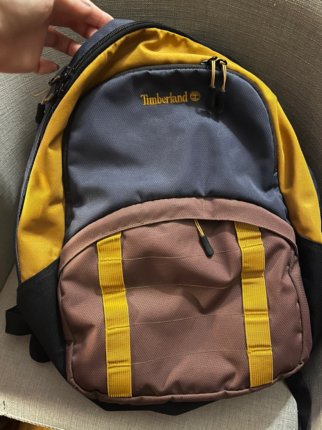 Timberland backpack in navy blue, mustard yellow, and brown.