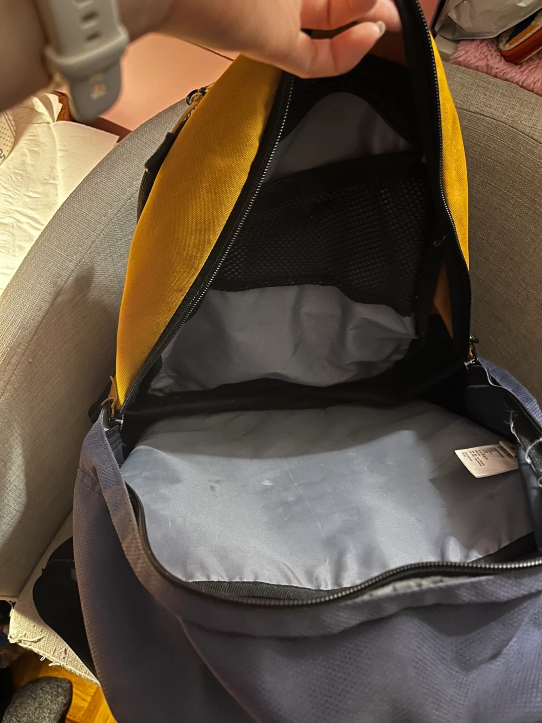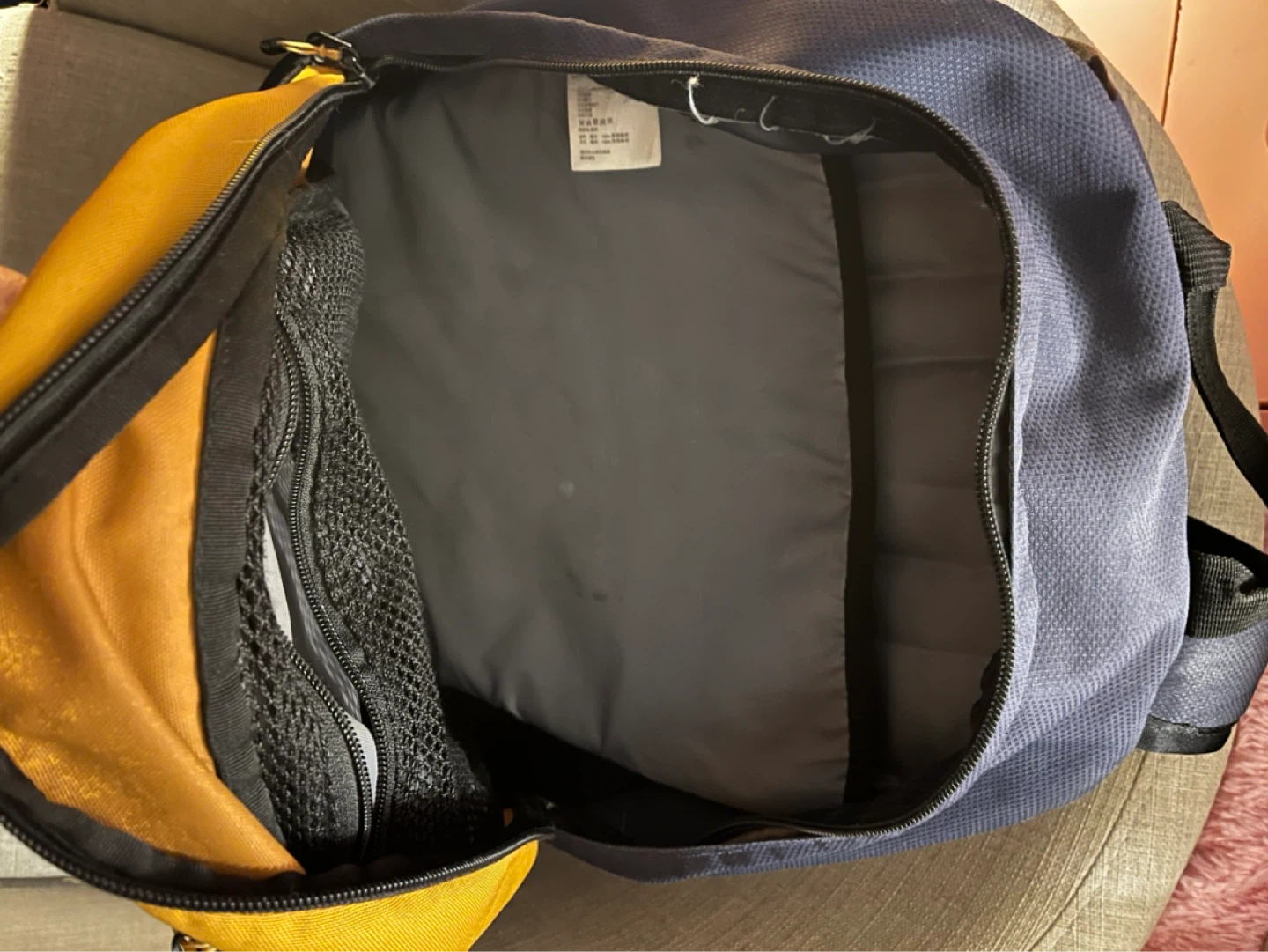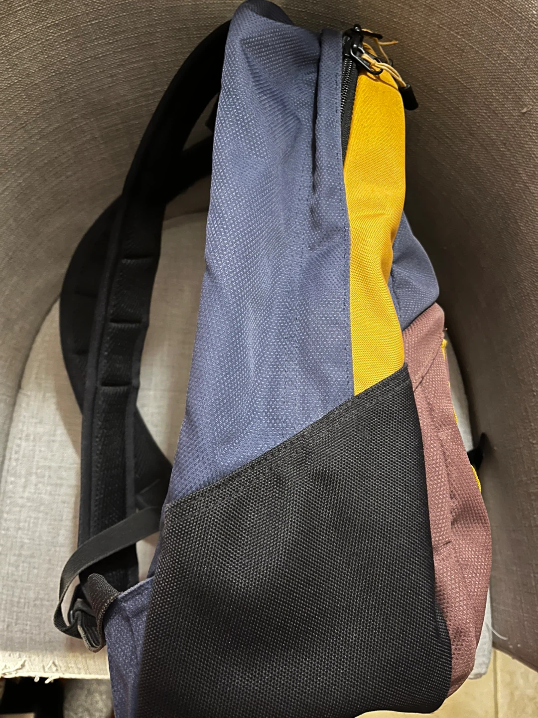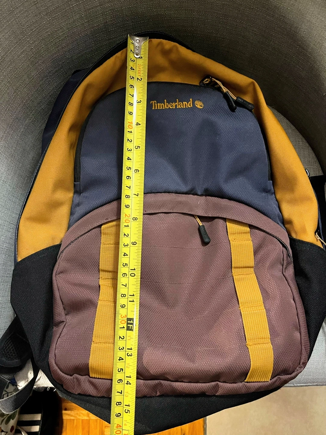 Timberland backpack in navy blue, mustard yellow, and brown.