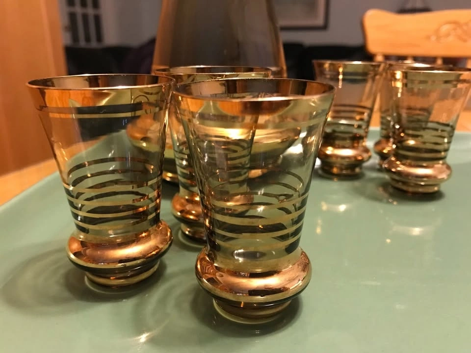 Vintage decanter with 6 shot glasses, amber color with embellished gold leaf. Made in Czechoslovakia. In great condition, no chips or cracks. Decanter: 9"H (11.25"H with topper). Shot Glass: 2.5"H. Pickup at Winston Churchill Blvd & Burnhamthorpe Rd W in Mississauga, ON.