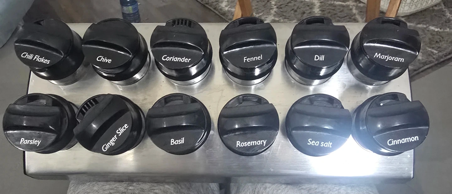 Includes chili flakes, chive, coriander, fennel, dill, marjoram, parsley, ginger slice, basil, rosemary, sea salt, and cinnamon. The spice rack is made of stainless steel with black rotating spice containers. It's great for keeping your kitchen organized and spices easily accessible!