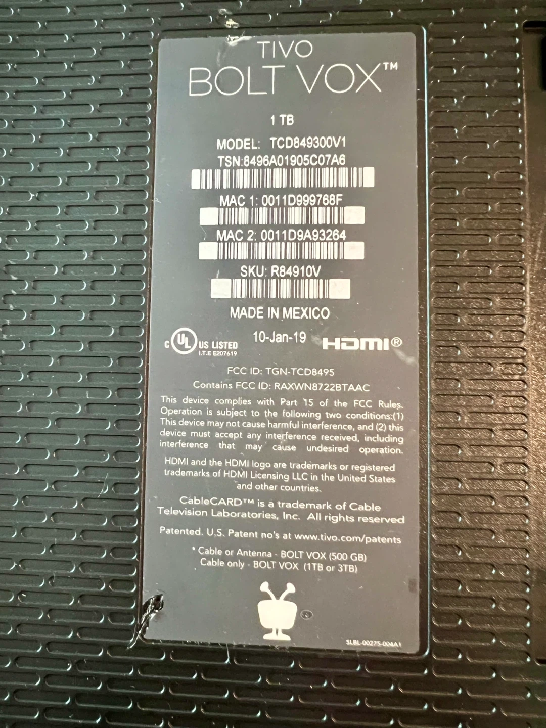 This TiVo BOLT VOX is a 1TB DVR. It includes the TiVo BOLT VOX unit and its remote. Remote tested and works. The unit's model is TCD849300V1. It was made in Mexico on January 10, 2019.