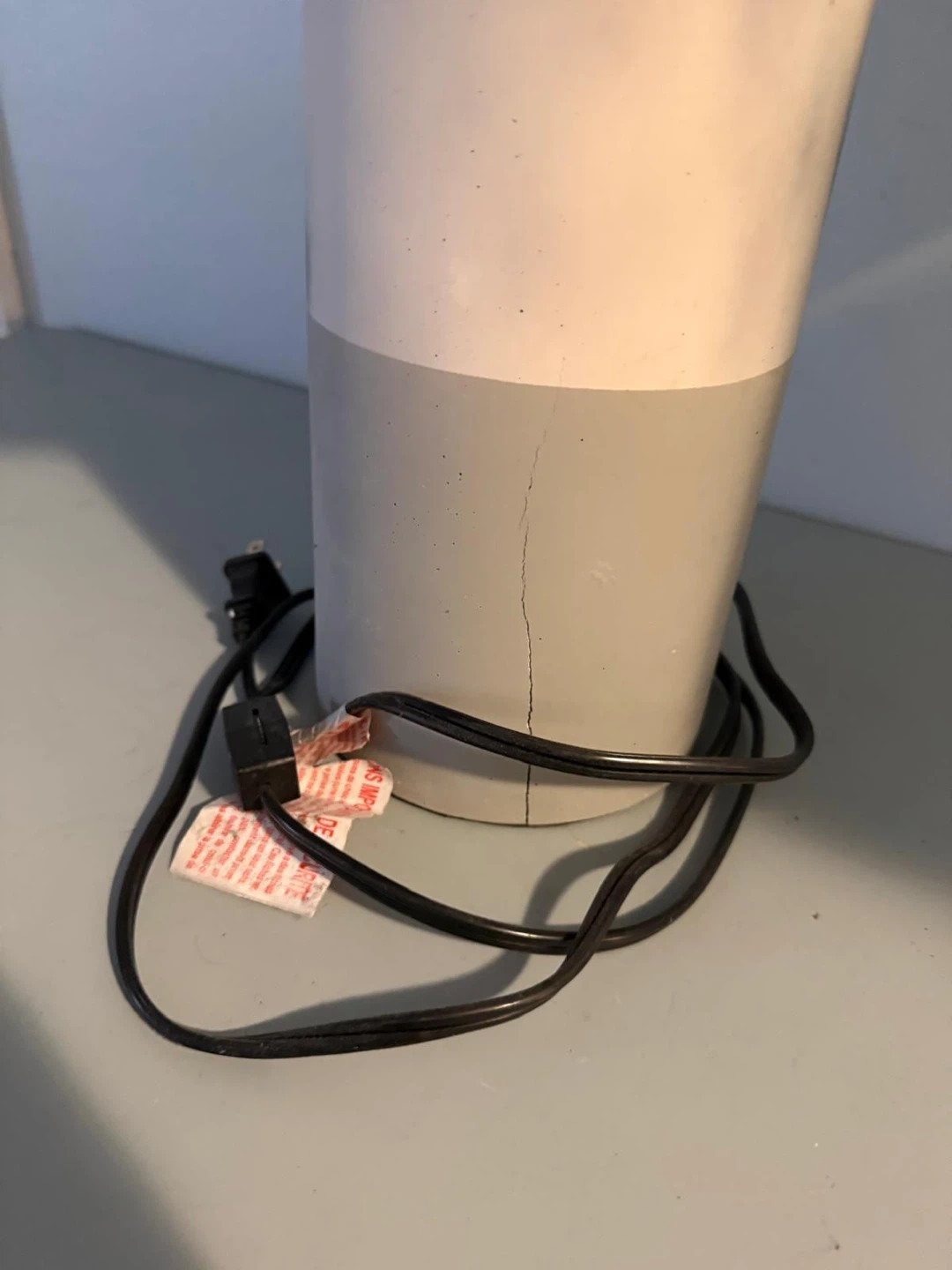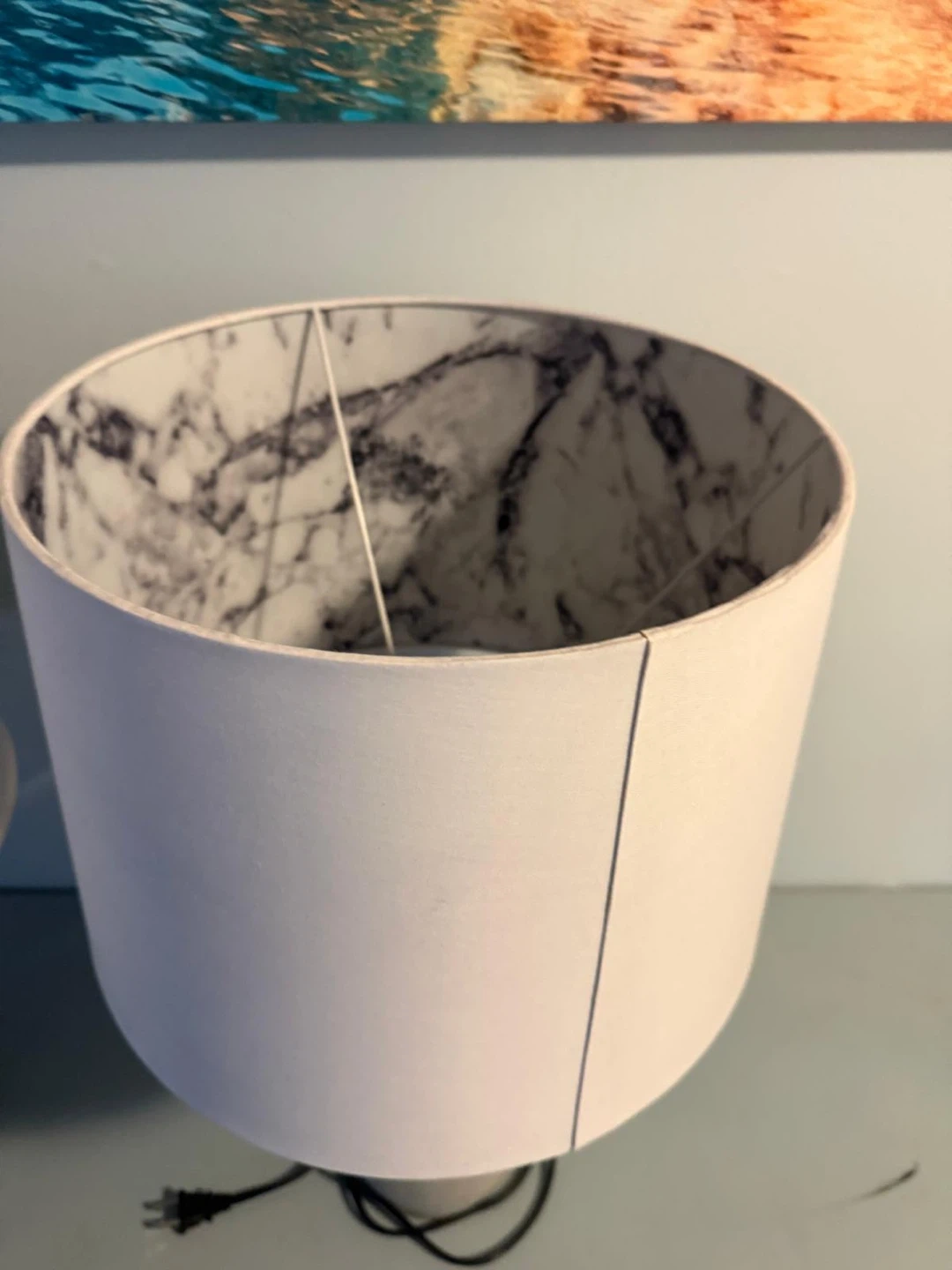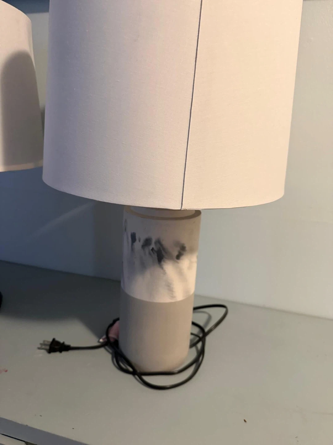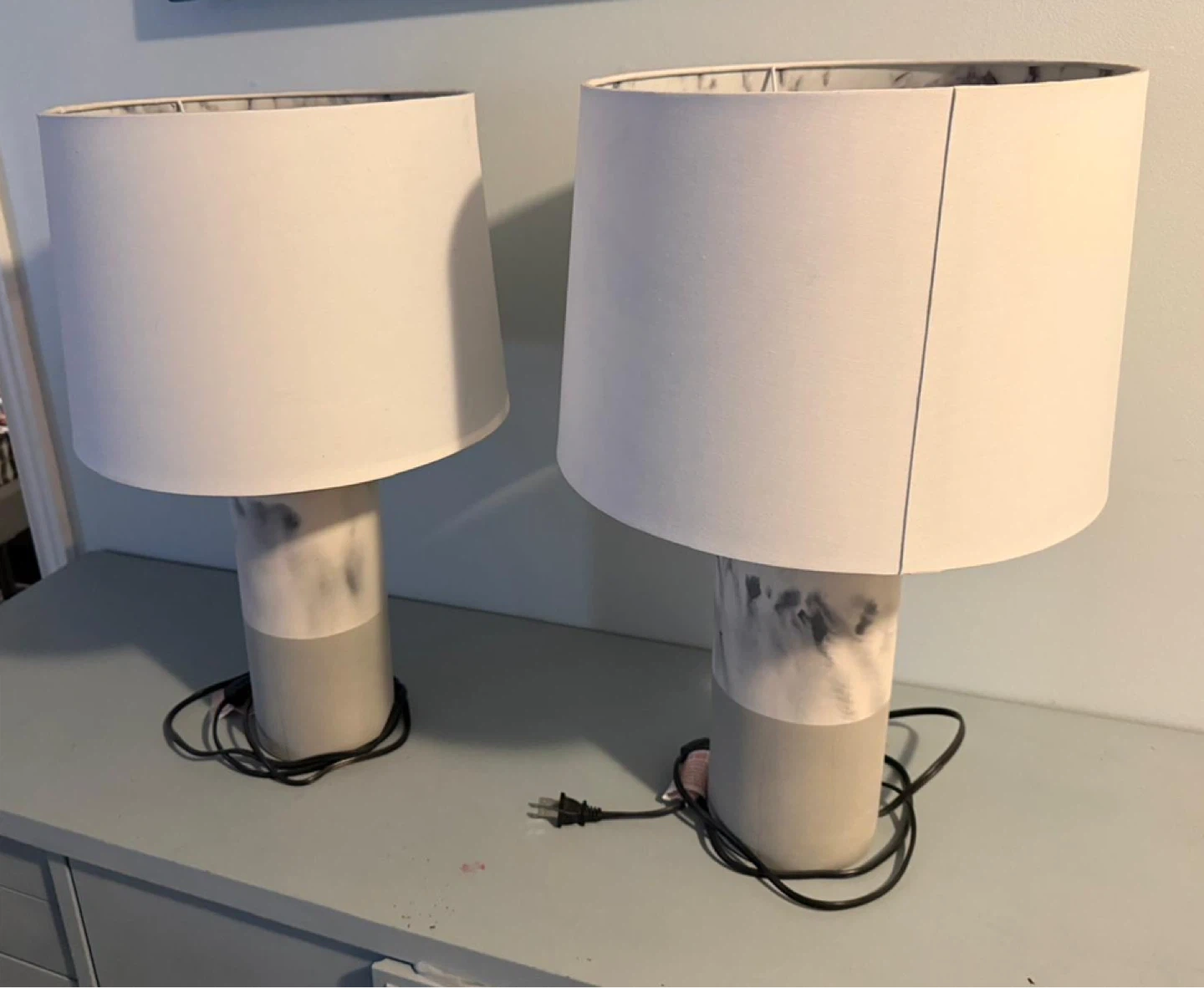 Two table lamps with white drum shades (marble effect) and ceramic bases. Bases have a grey and white marble-like pattern. Lamps have working cords and plugs.