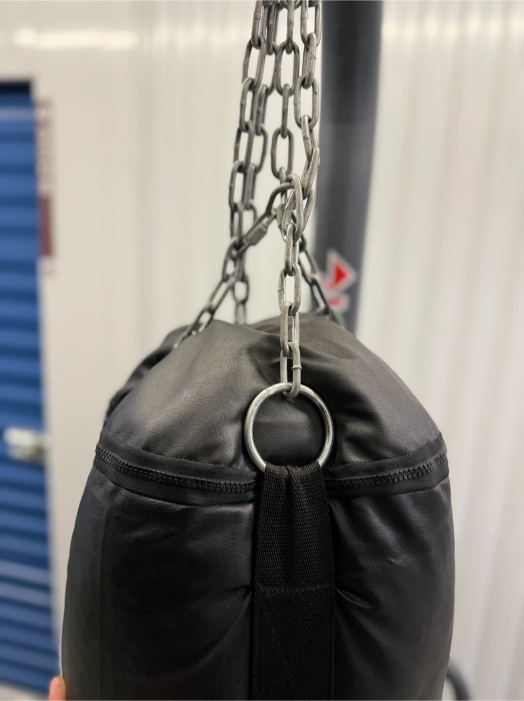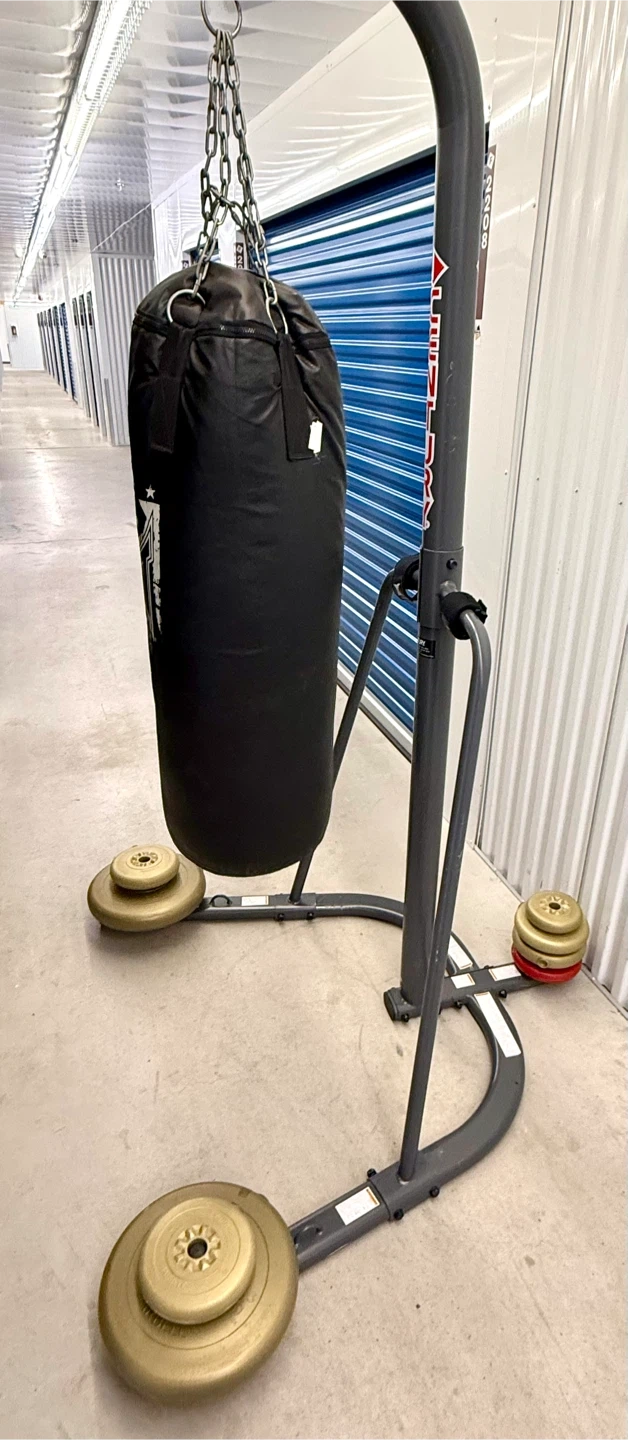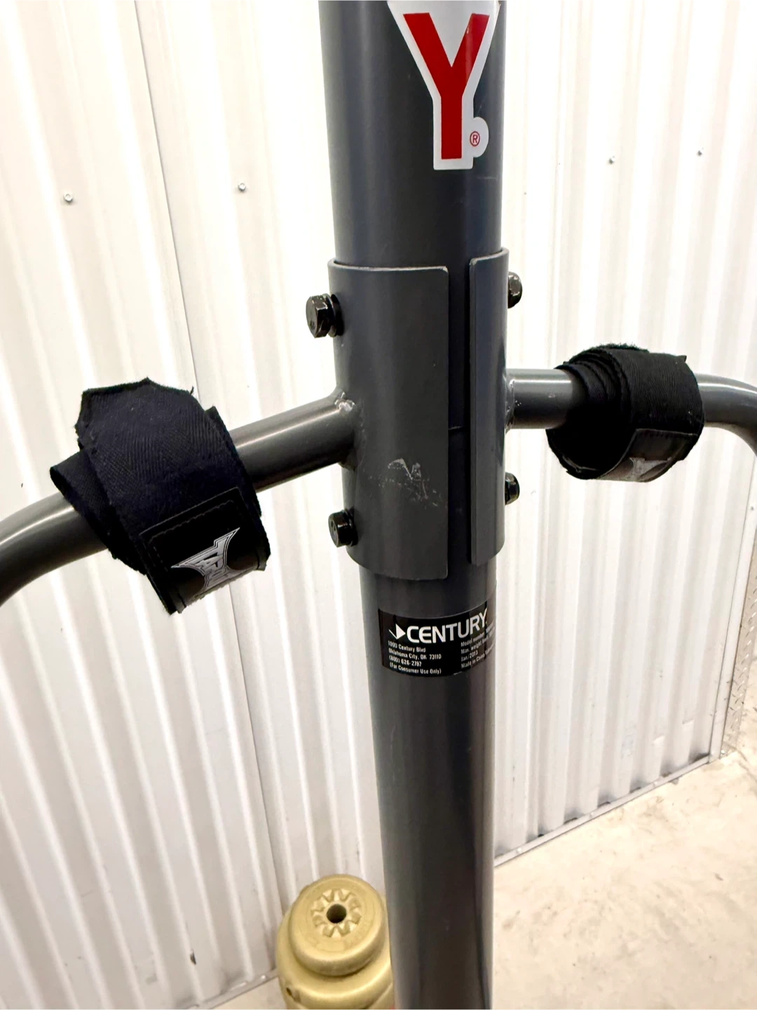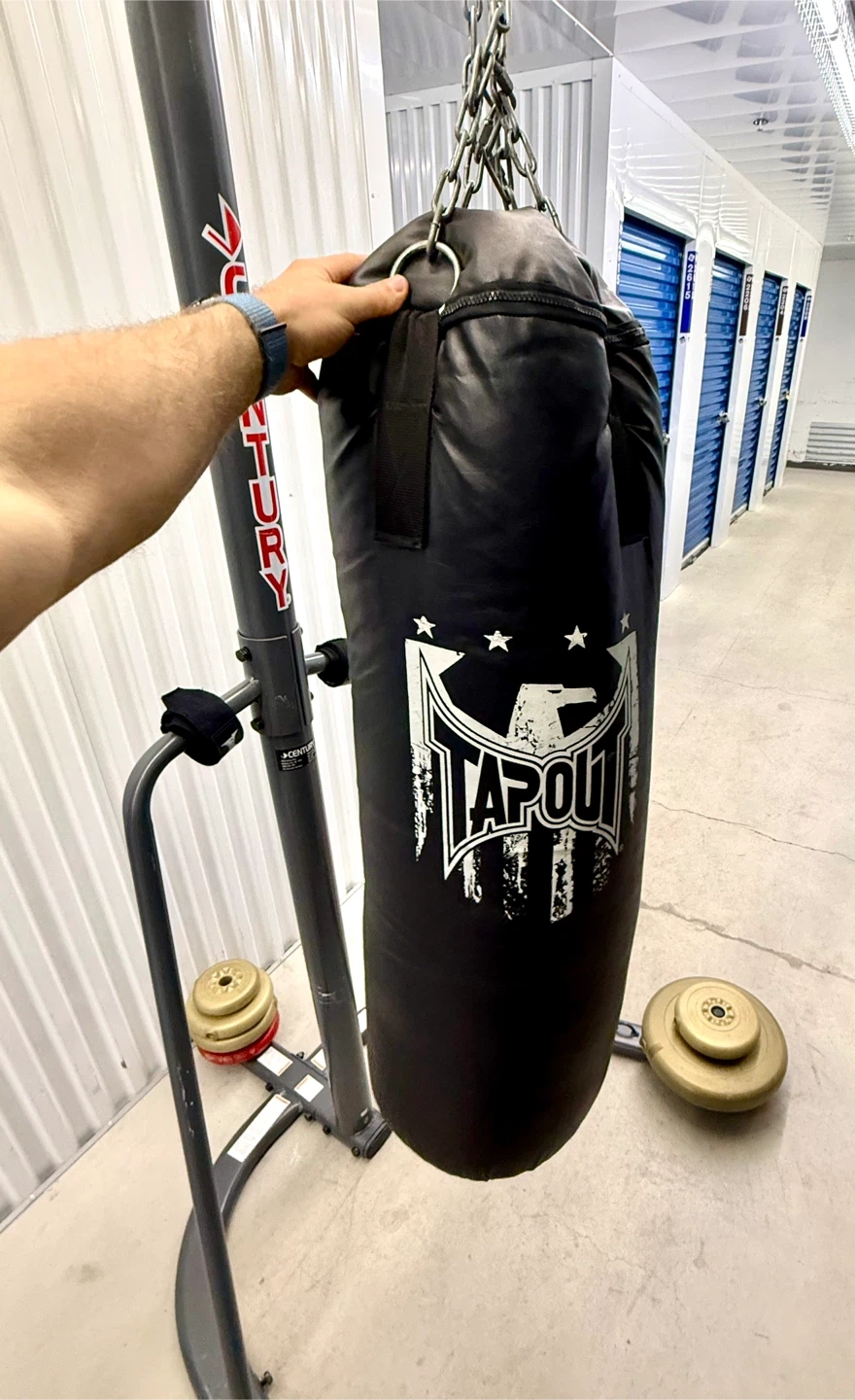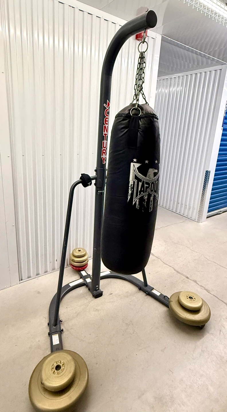 Century heavy bag stand with a TapouT punching bag. Includes weight plates for stability. Great for home workouts!