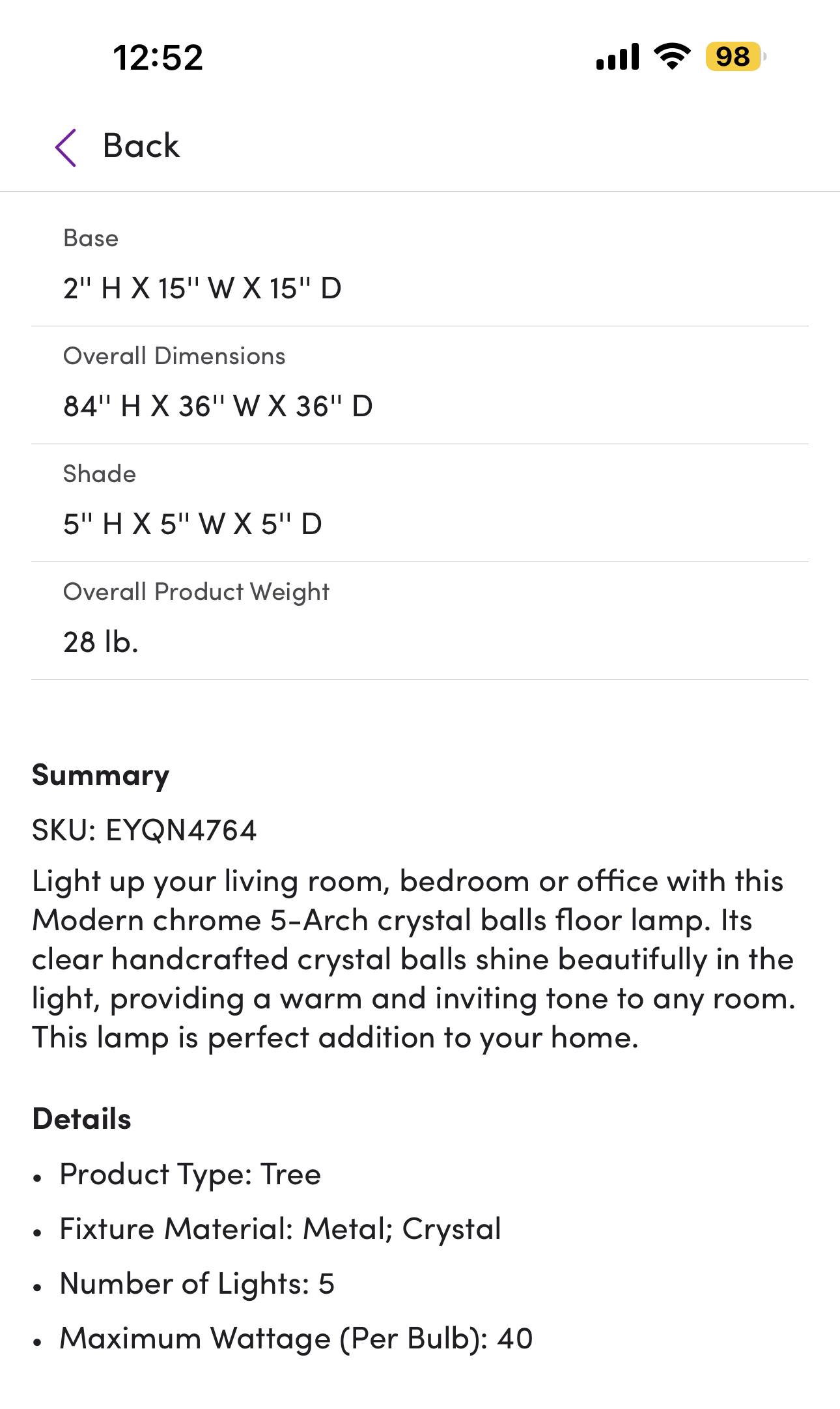 1 / 51 / 5Buy & SellArch lampArch lamp$150Gorgeous arch lamp with crystal balls. Dimensions in last pictures. Paid over $600 Pick up only from distillery districtWHERE TO MEETDistillery DistrictView MapSELLERverifiedJyotsnaEntertainment District1428 reviews0 chats·1 favorites·30 viewsSEND CHAT TO SELLERHi Jyotsna! I’m interested in your listing.Hi Jyotsna! I’m interested in your listing.Get the Karrot app to chatSign In to chat