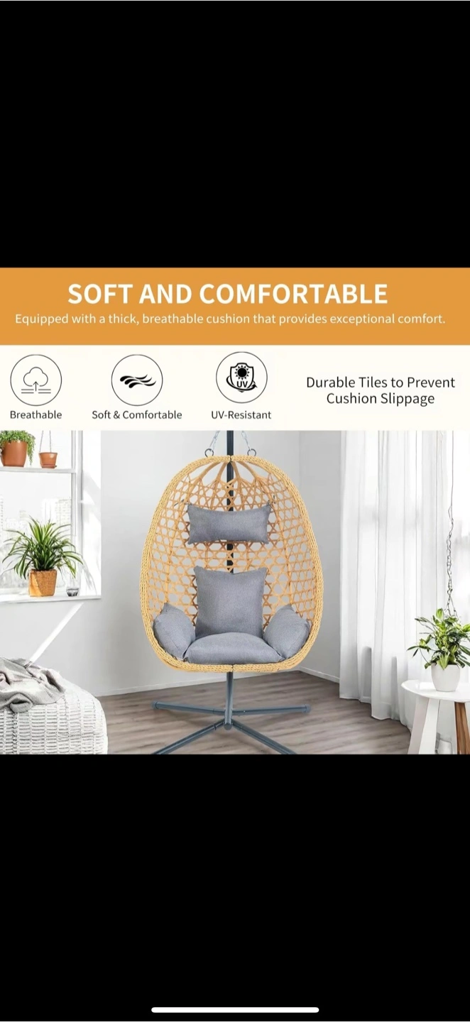 This hanging egg chair is perfect for relaxing indoors or outdoors! It has a thick, breathable cushion that provides exceptional comfort. The durable tiles prevent cushion slippage, and it's UV-resistant. Soft and comfortable!