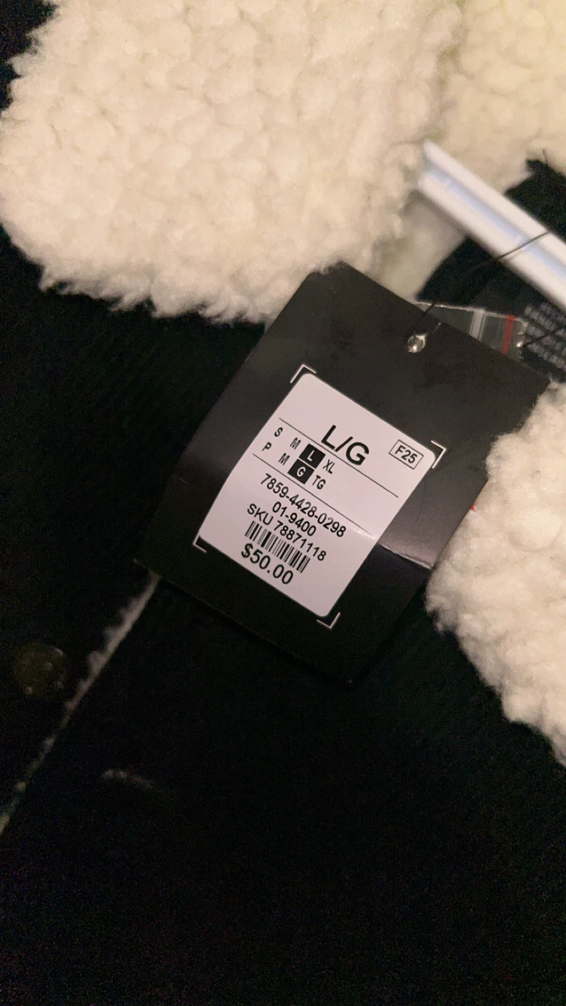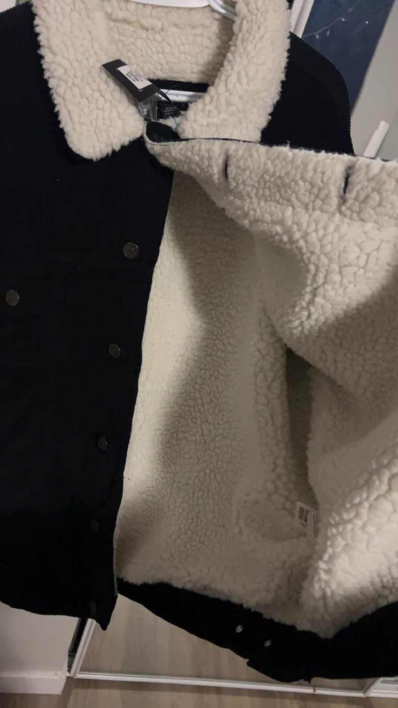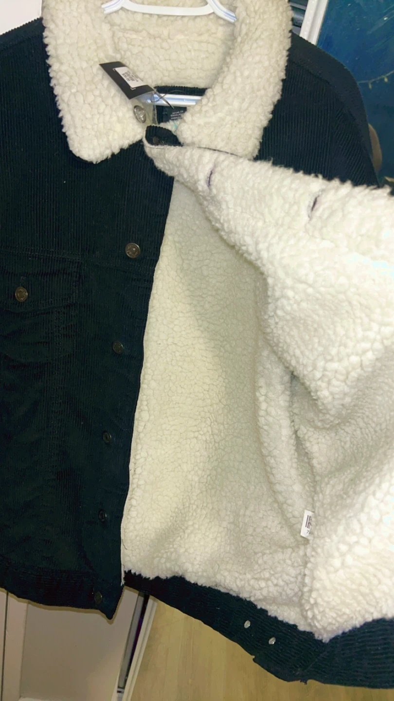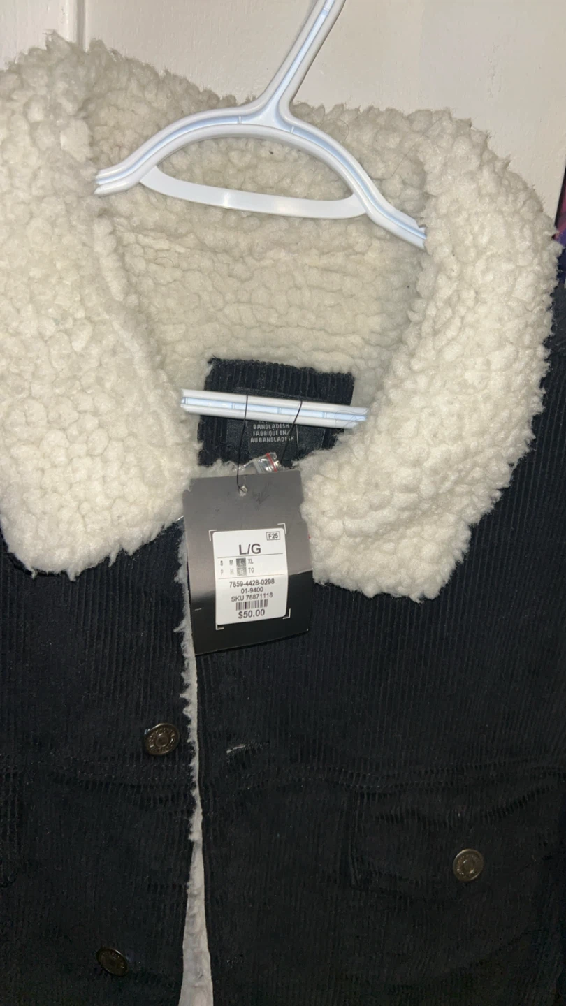 Black corduroy jacket with a cozy sherpa lining and collar. It's a size Large. This jacket is perfect for cooler weather!