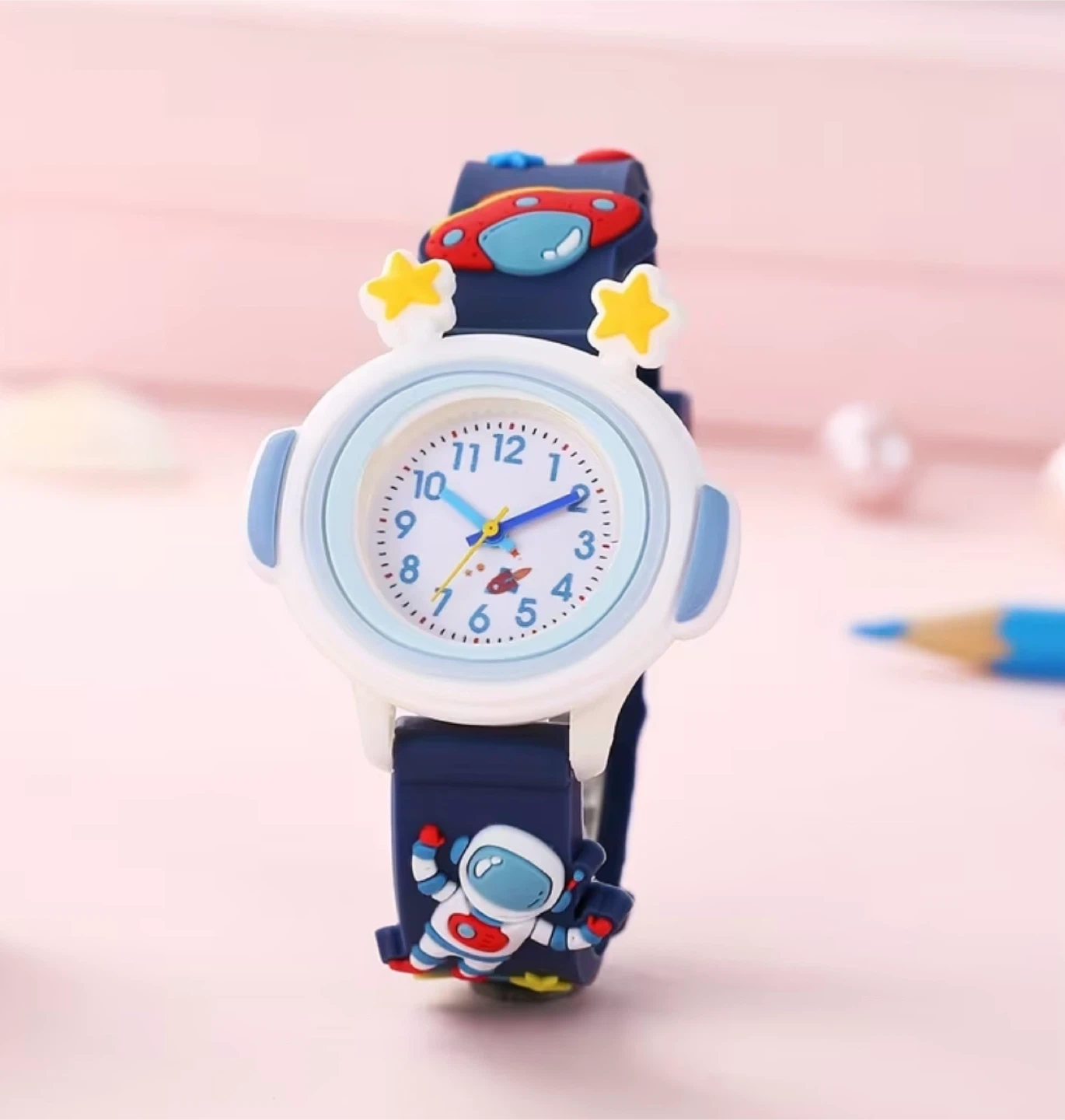 Fun kids' watch with an astronaut and UFO theme. Features a blue strap and a white watch face with colourful numbers. It's a great way for kids to learn to tell time!