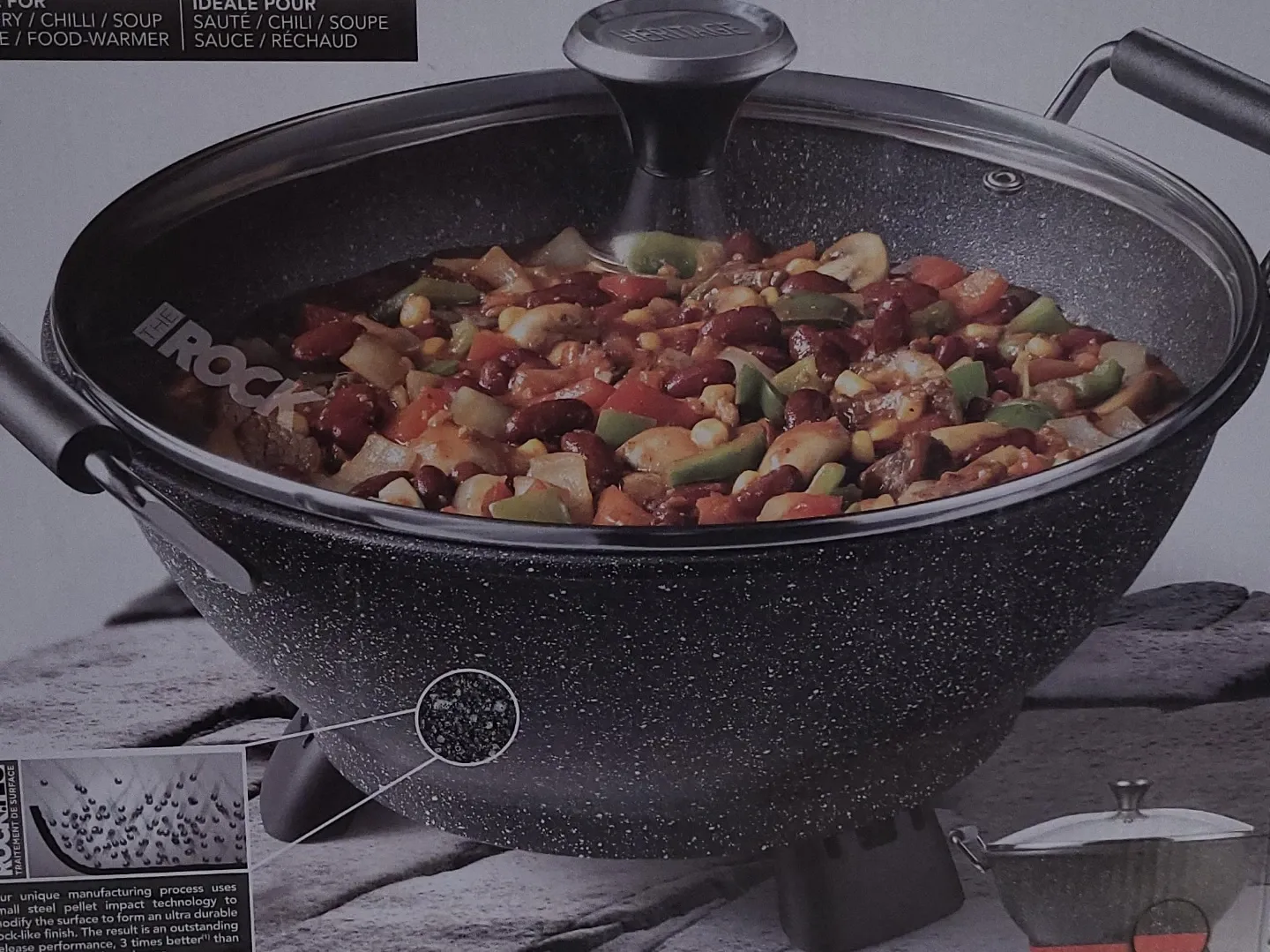 This Heritage by Rock electric multi pot is designed for versatility. It's perfect for sautéing, chilling, soupy dishes, and warming food. The non-stick surface makes cooking and cleaning a breeze! This item is new and still in the box. NIB