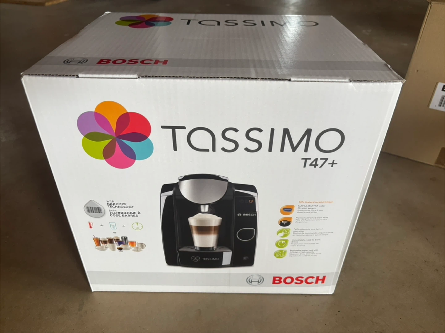 This Bosch Tassimo T47+ is a coffee machine that uses barcode technology for brewing. It brews various beverages like espresso, latte, and tea. It's ready to brew in under a minute.