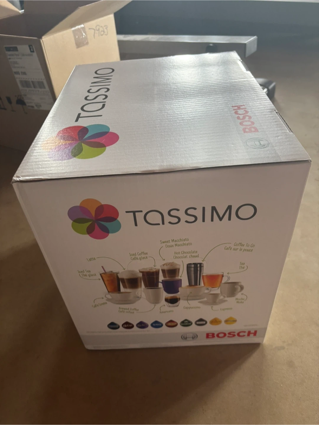 This Bosch Tassimo T47+ is a coffee machine that uses barcode technology for brewing. It brews various beverages like espresso, latte, and tea. It's ready to brew in under a minute.