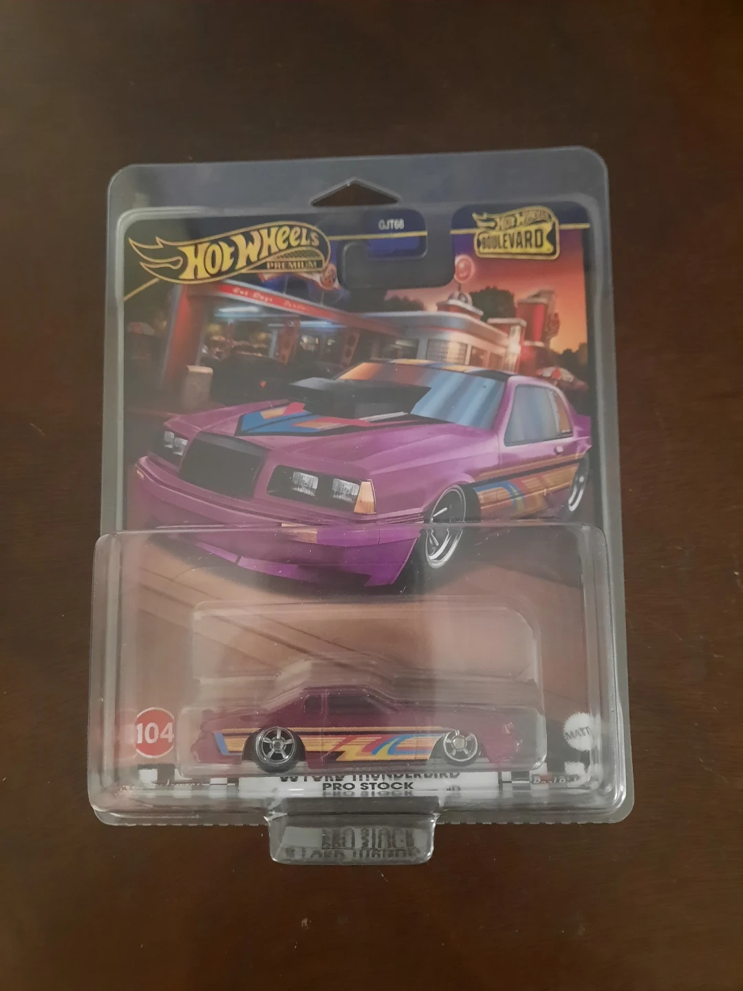 It's a 1:64 scale die-cast car from the Hot Wheels Premium Boulevard series. This model depicts a '92 Ford Thunderbird Pro Stock. The packaging includes the protective blister case.