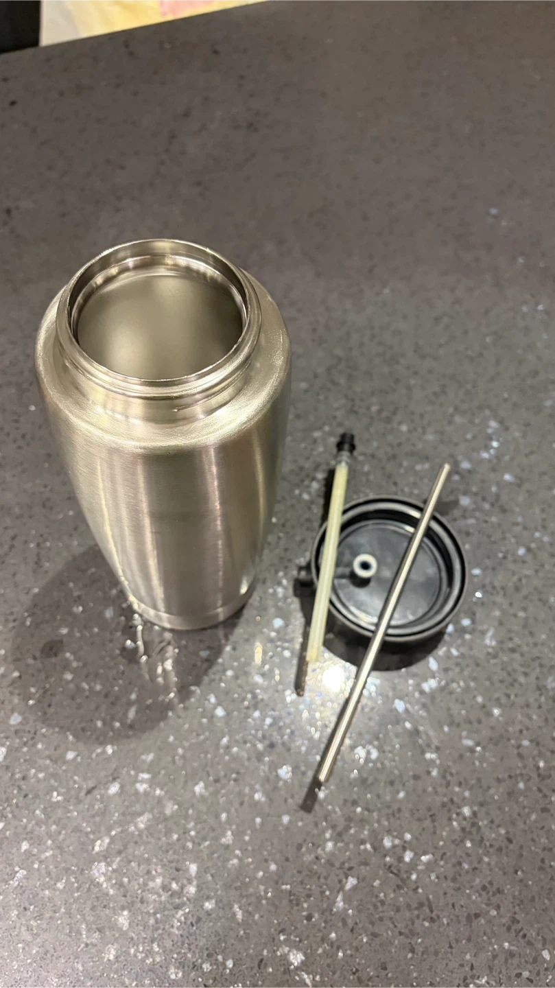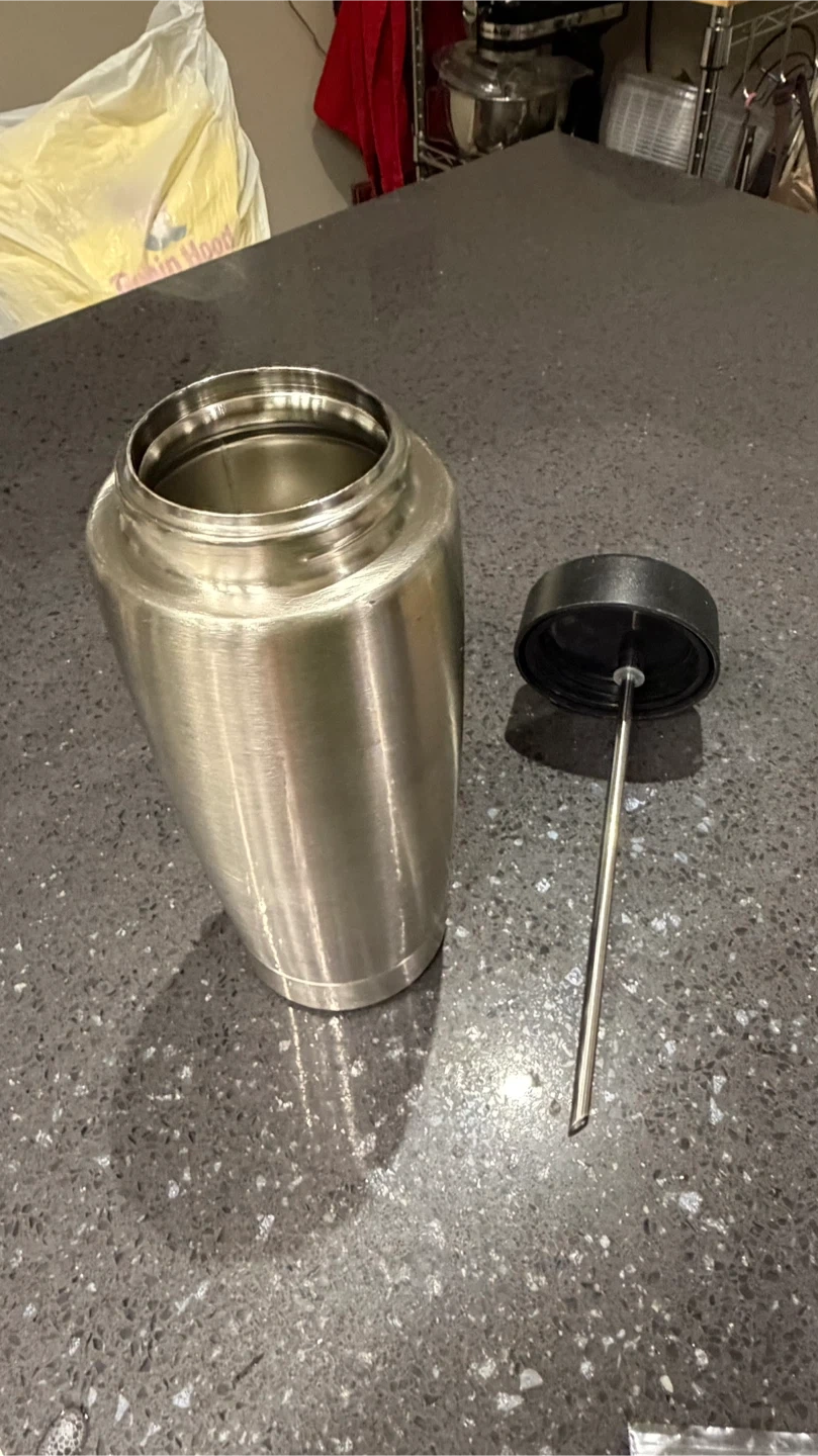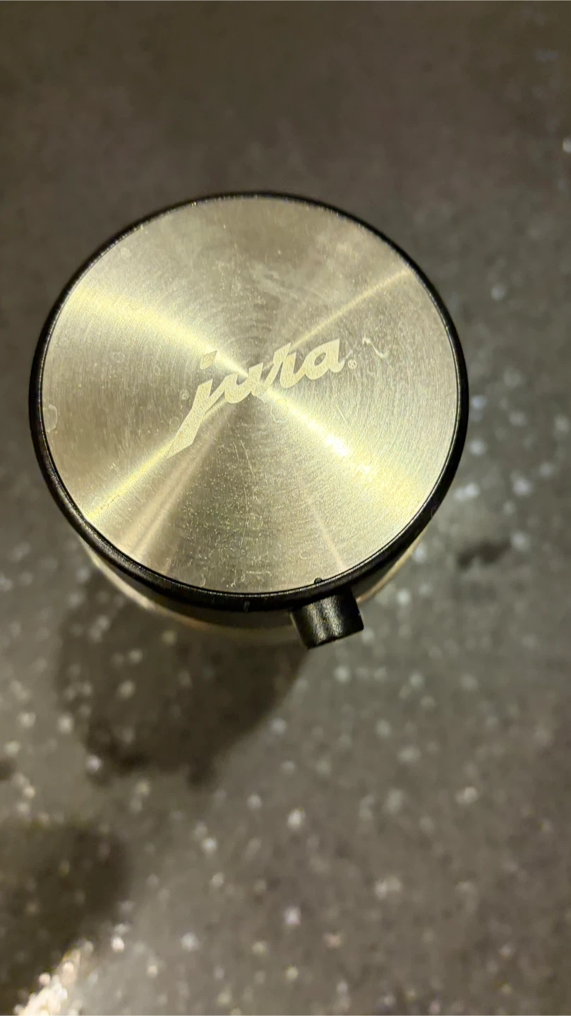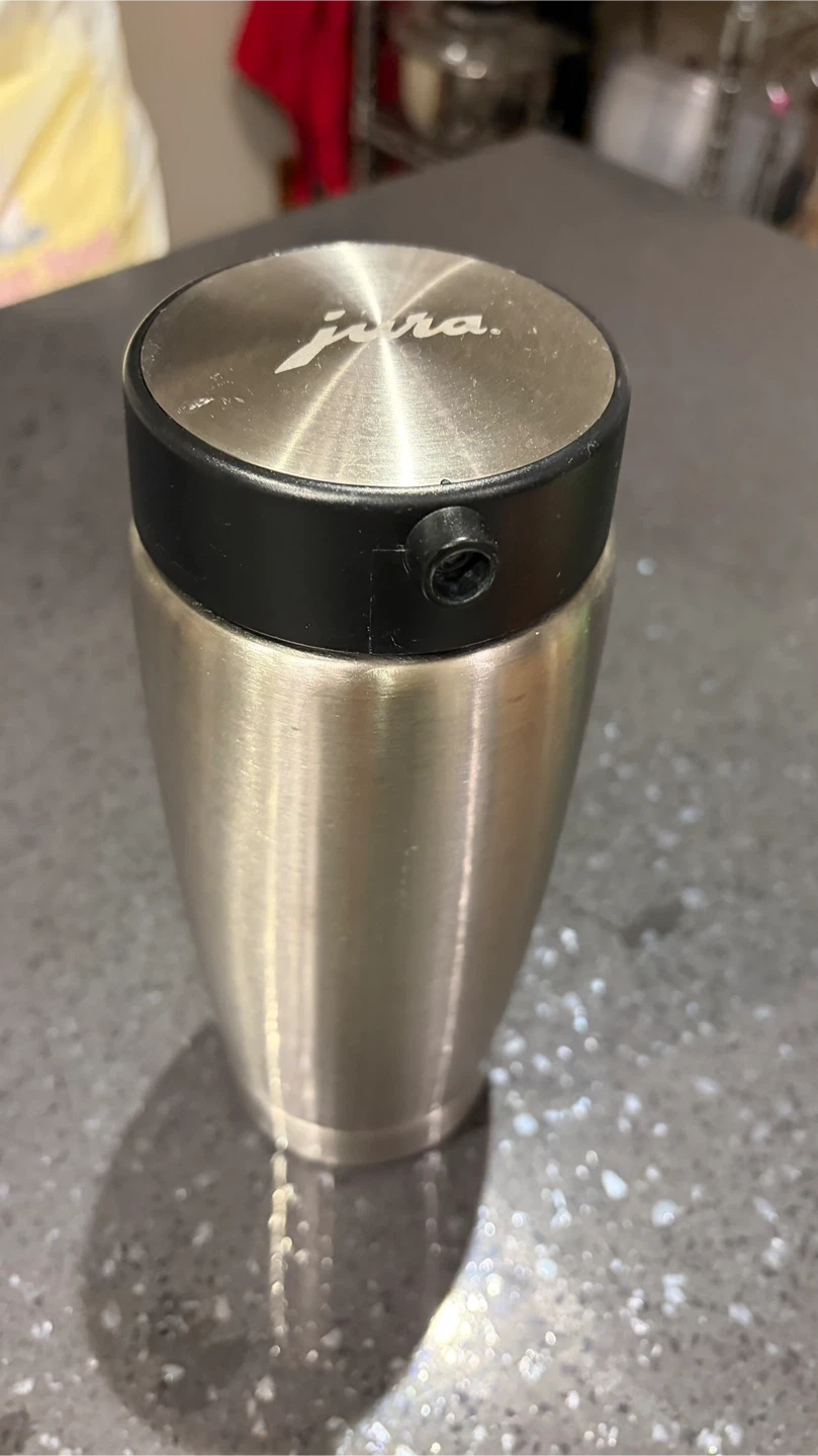 Jura stainless steel vacuum milk container. It's made of brushed metal with a black plastic lid and tube attachment. It has a capacity for 0.6 litres of cold milk storage for your Jura coffee machine. New sells for $175.00