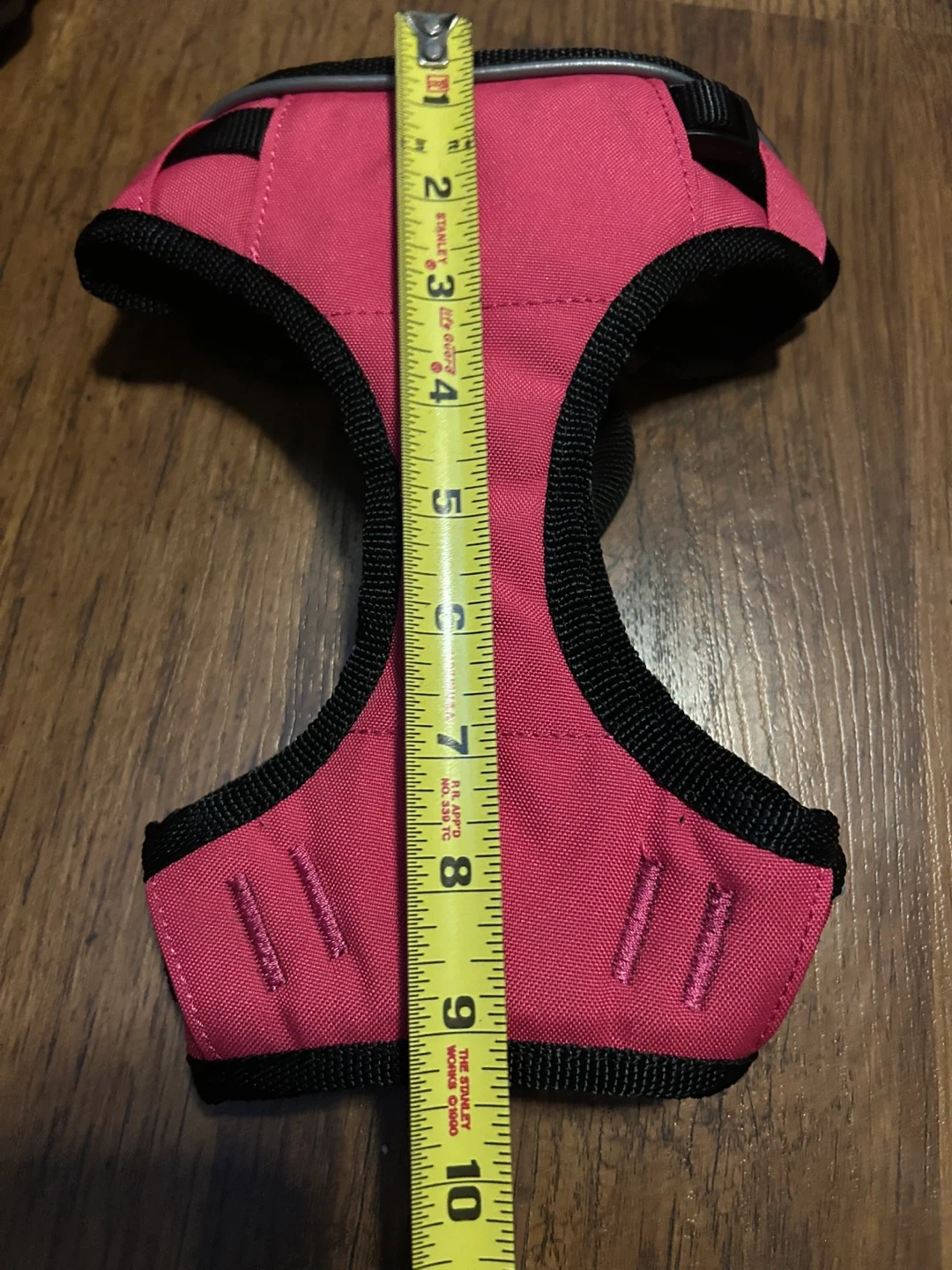 Selling a pink dog harness! It is a size small and in great condition. The harness is adjustable and comfortable for your furry friend. It measures approximately 7 inches in height and 9 inches in length.