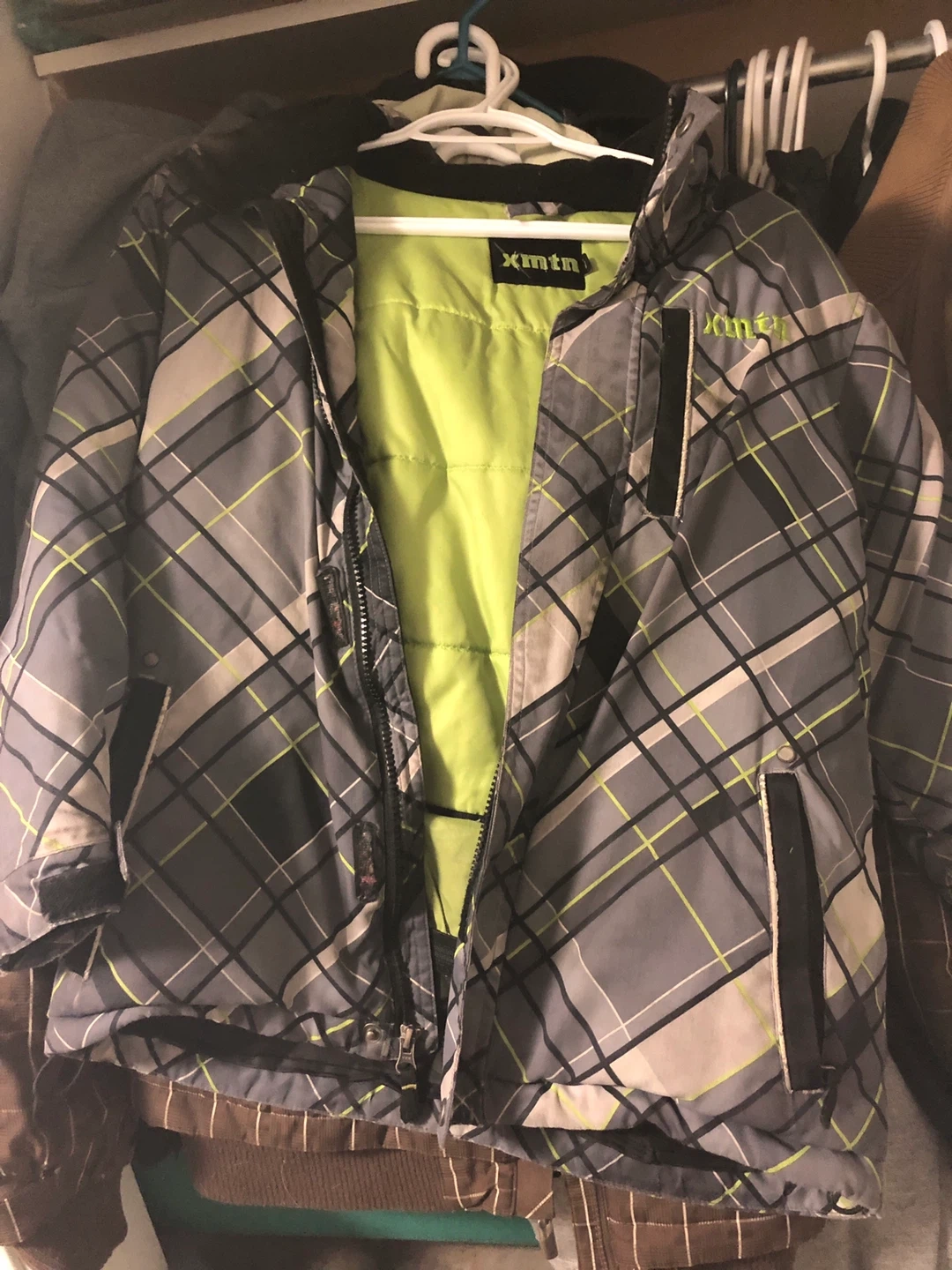 60Selling a XMTN winter jacket with a cool plaid pattern and a bright green lining. It's in great shape and ready to keep you warm this winter!