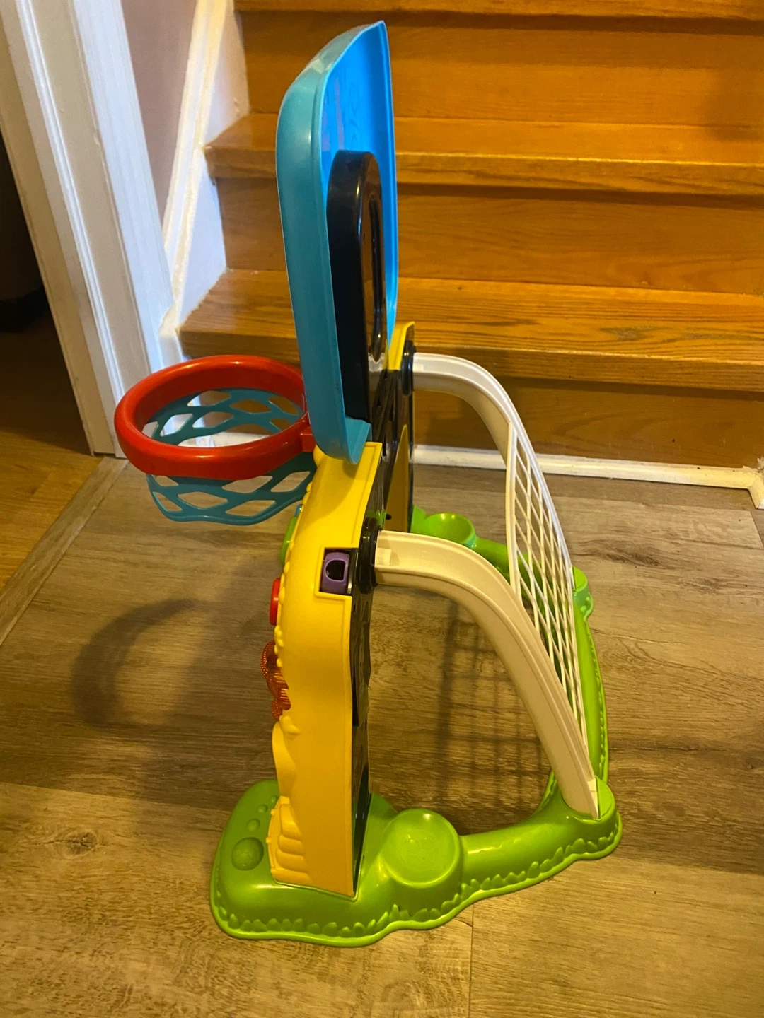 * Two ways to play: shoot a basket or score a goal with the interactive basketball hoop and soccer goal