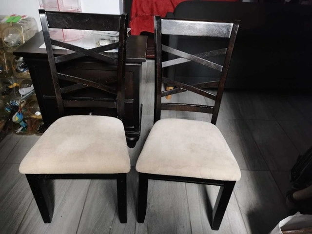 These used dining chairs are a simple and functional addition to any dining space, featuring a dark wood frame and neutral-toned cushioned seat. The chairs are in good condition, ready to provide comfortable seating at your table. Standard dining chair size.