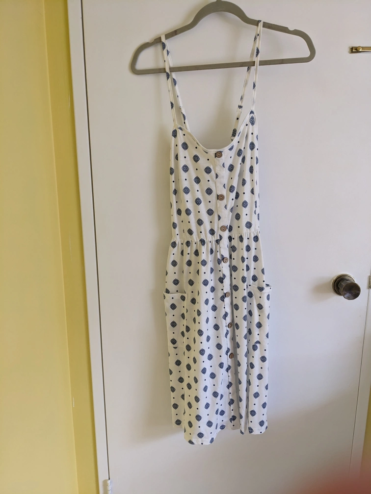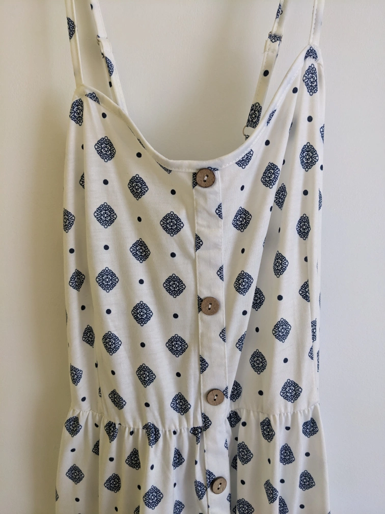 A cute and breezy sundress featuring a fun pattern! It's a size XL and perfect for warm weather. Great for casual outings or dressing up for a summer evening out