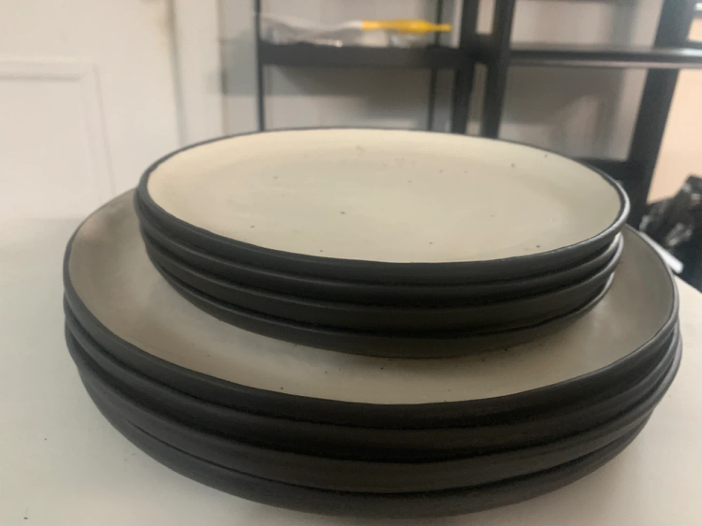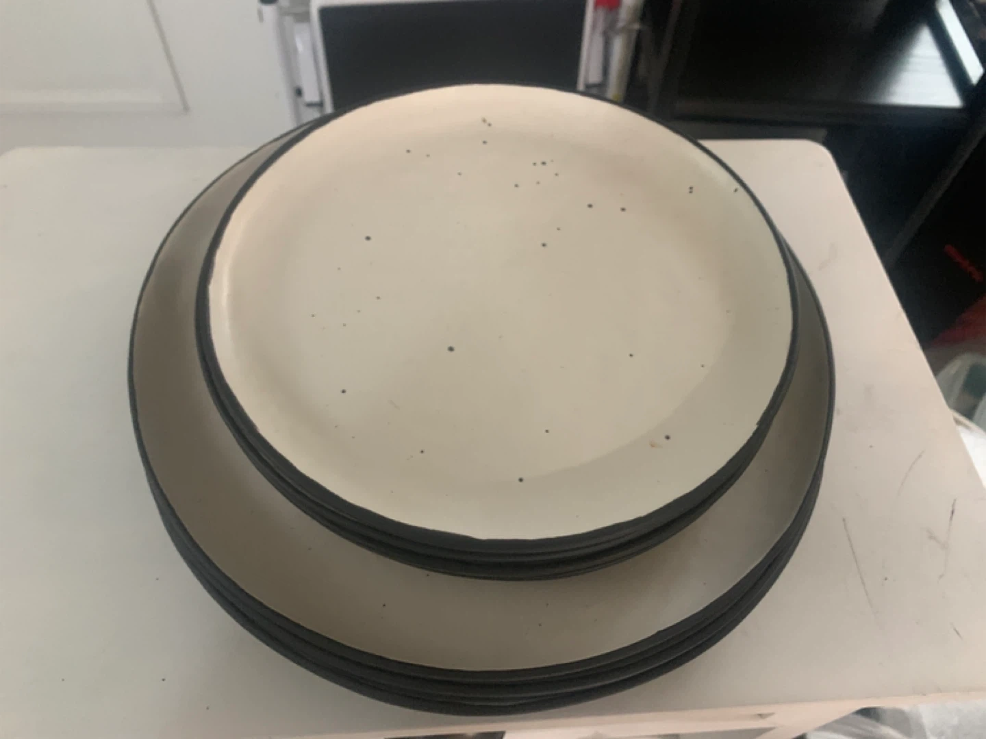 NEVER USED! Selling a set of stoneware bowls (4 small, 4 medium) and plates (4 medium and 4 large) in a stylish blue and white speckled design. They are in perfect condition and lovely for adding a modern touch to your table setting!