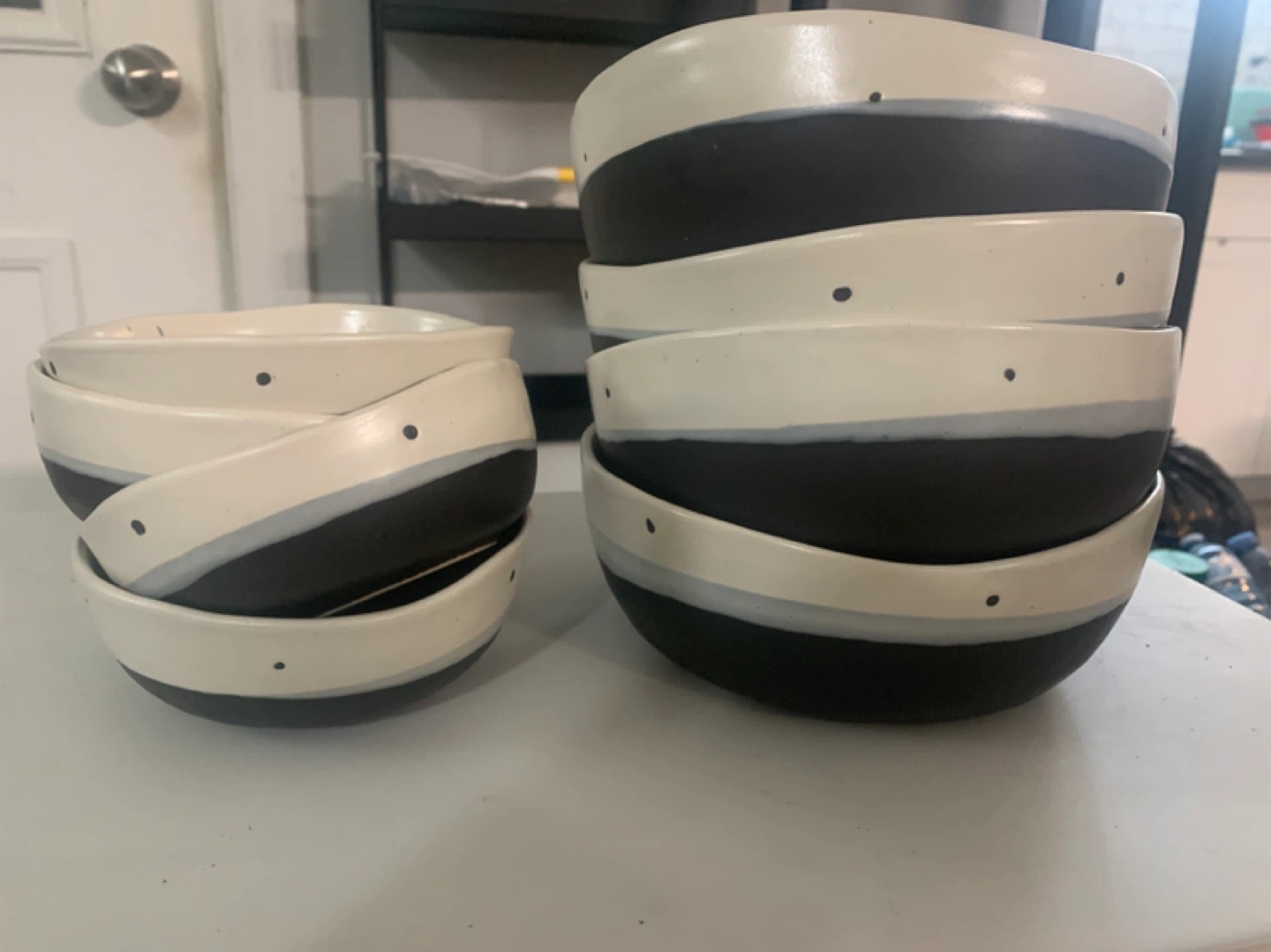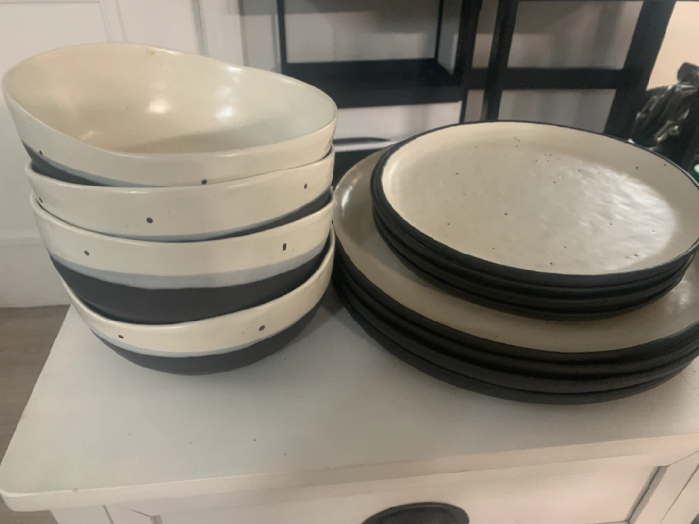NEVER USED! Selling a set of stoneware bowls (4 small, 4 medium) and plates (4 medium and 4 large) in a stylish blue and white speckled design. They are in perfect condition and lovely for adding a modern touch to your table setting!