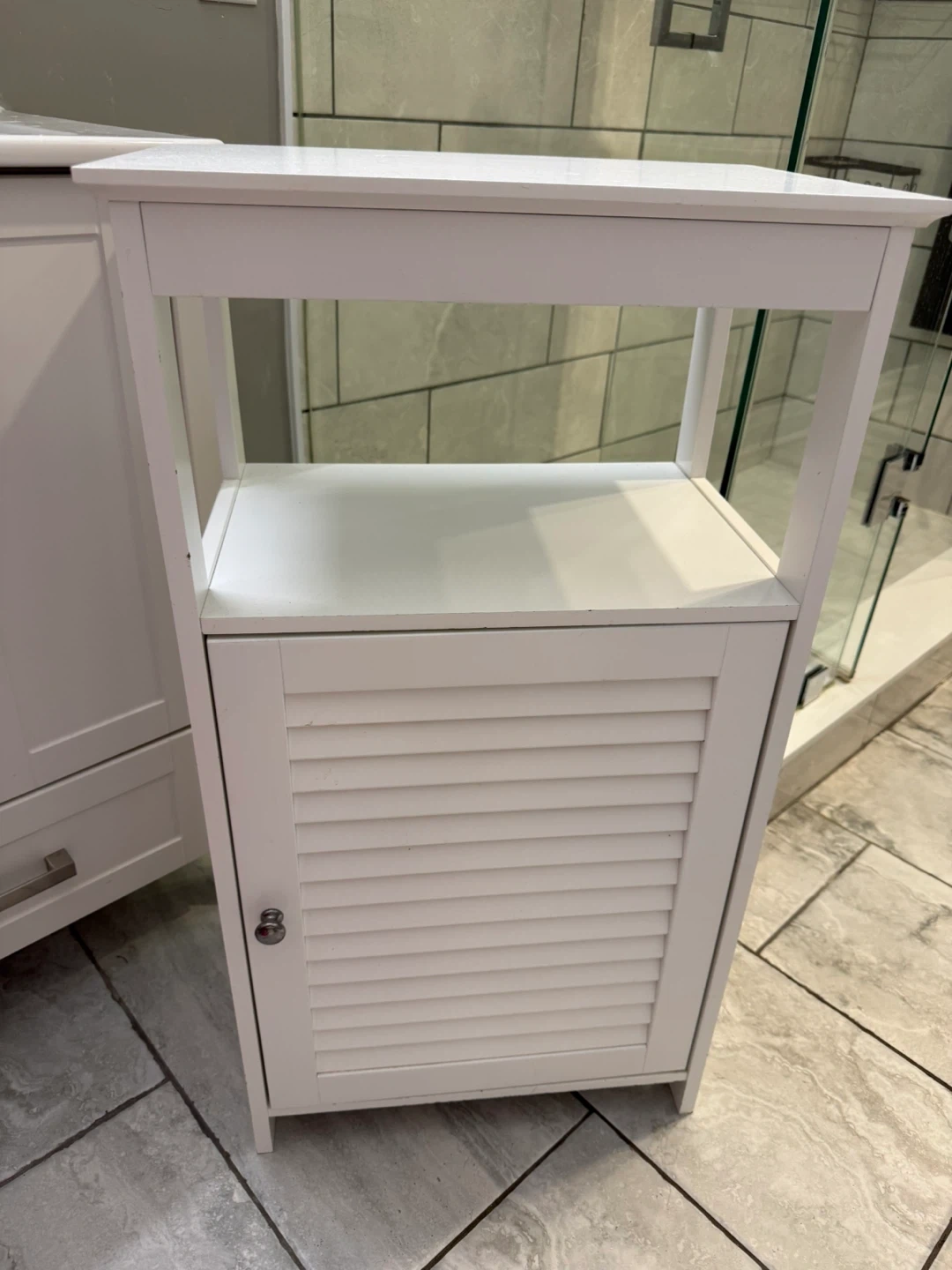 White storage cabinet with one door and an interior shelf. It has an open shelf above the cabinet door. Perfect for small spaces! Pick up only woodbine and Danforth