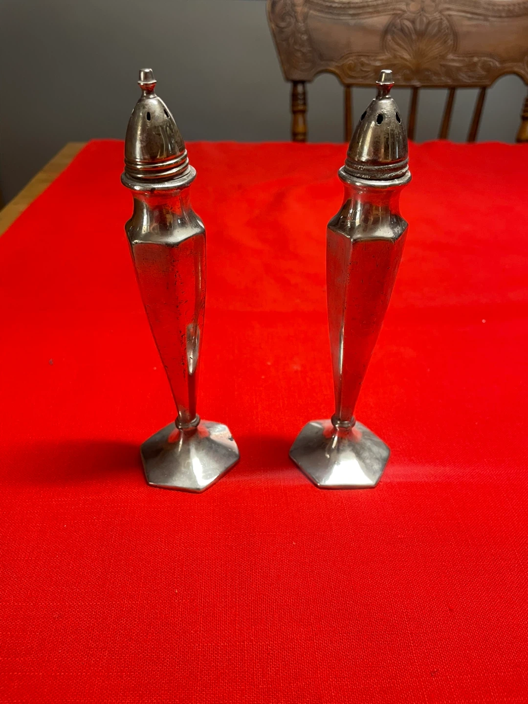 Selling a vintage set of silver plated salt and pepper shakers! They have a unique hexagonal base and a sleek, streamlined design. Perfect for adding a touch of elegance to your dining table!