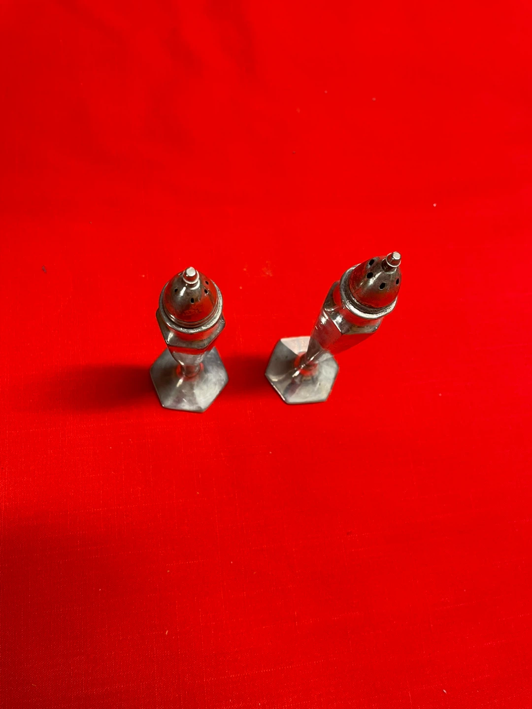 Selling a vintage set of silver plated salt and pepper shakers! They have a unique hexagonal base and a sleek, streamlined design. Perfect for adding a touch of elegance to your dining table!