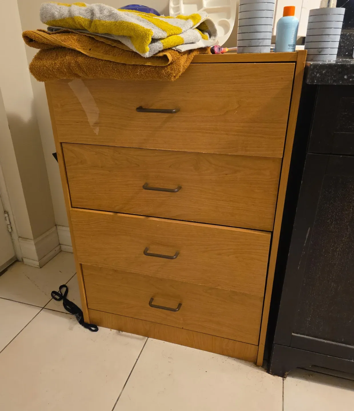 Four-drawer dresser with a light wood finish. It's a great storage solution for any room! The drawers have simple metal handles. Dimensions: 24" W x 18" D x 30" H.
