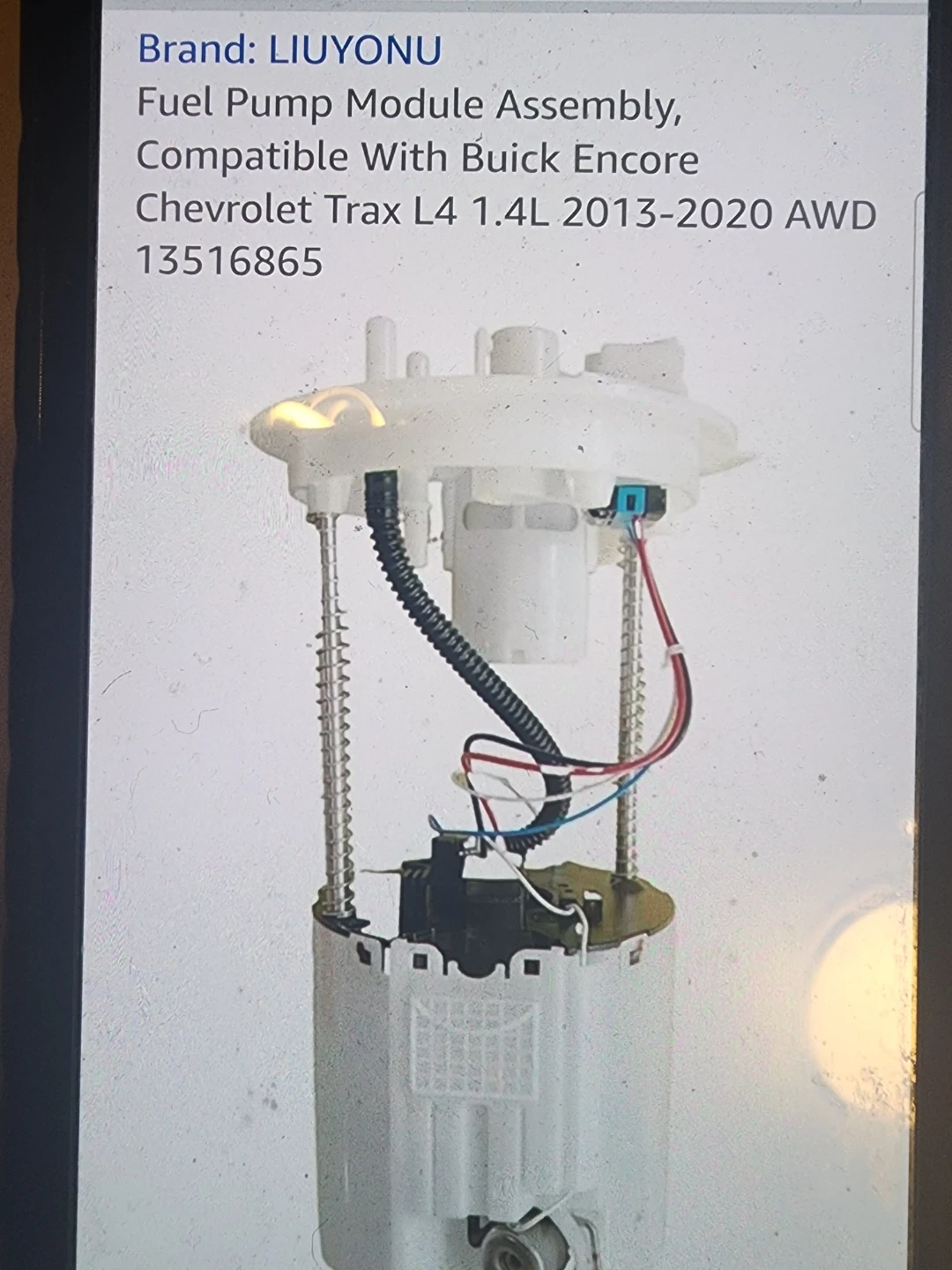 This is a LIUYONU fuel pump module assembly. It's compatible with Buick Encore and Chevrolet Trax L4 1.4L AWD models from 2013-2020. This part is for vehicle repair and maintenance.