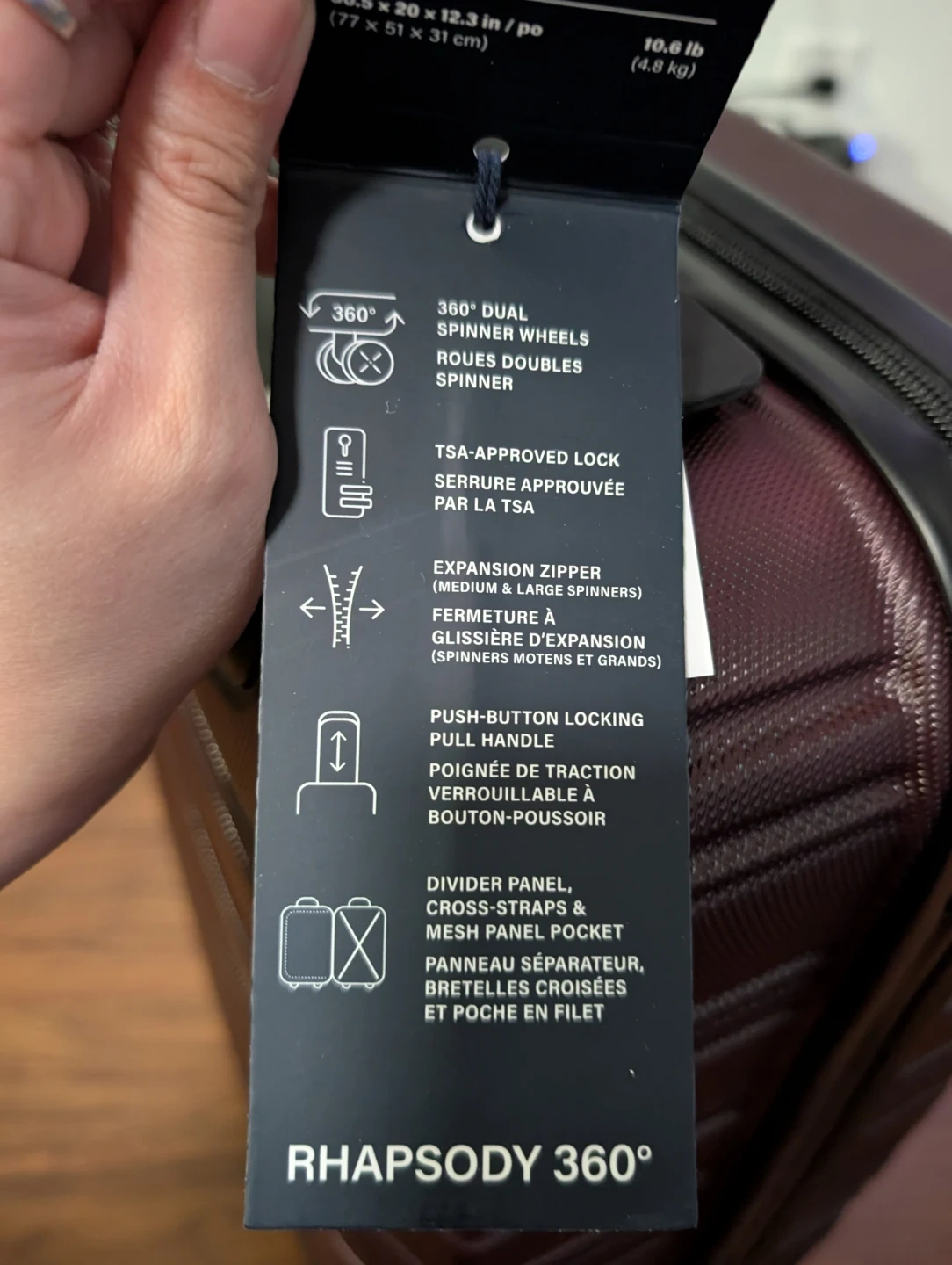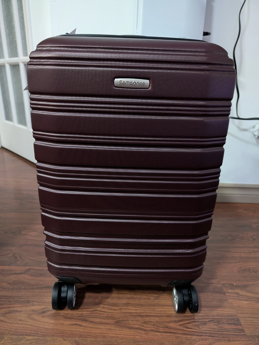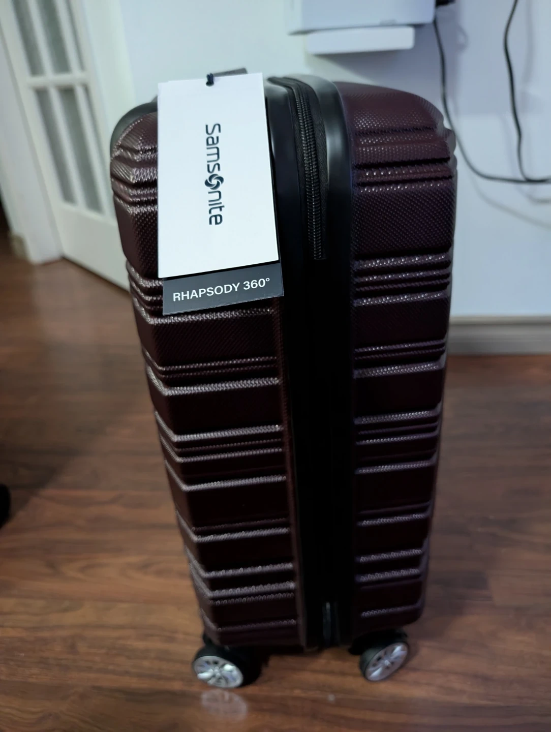 This is a Samsonite Rhapsody 360 spinner carry-on suitcase. It's made of rugged ABS material. It features dual spinner wheels, a TSA-approved lock, and an expansion zipper. The interior has a divider panel, cross-straps, and a mesh panel pocket.