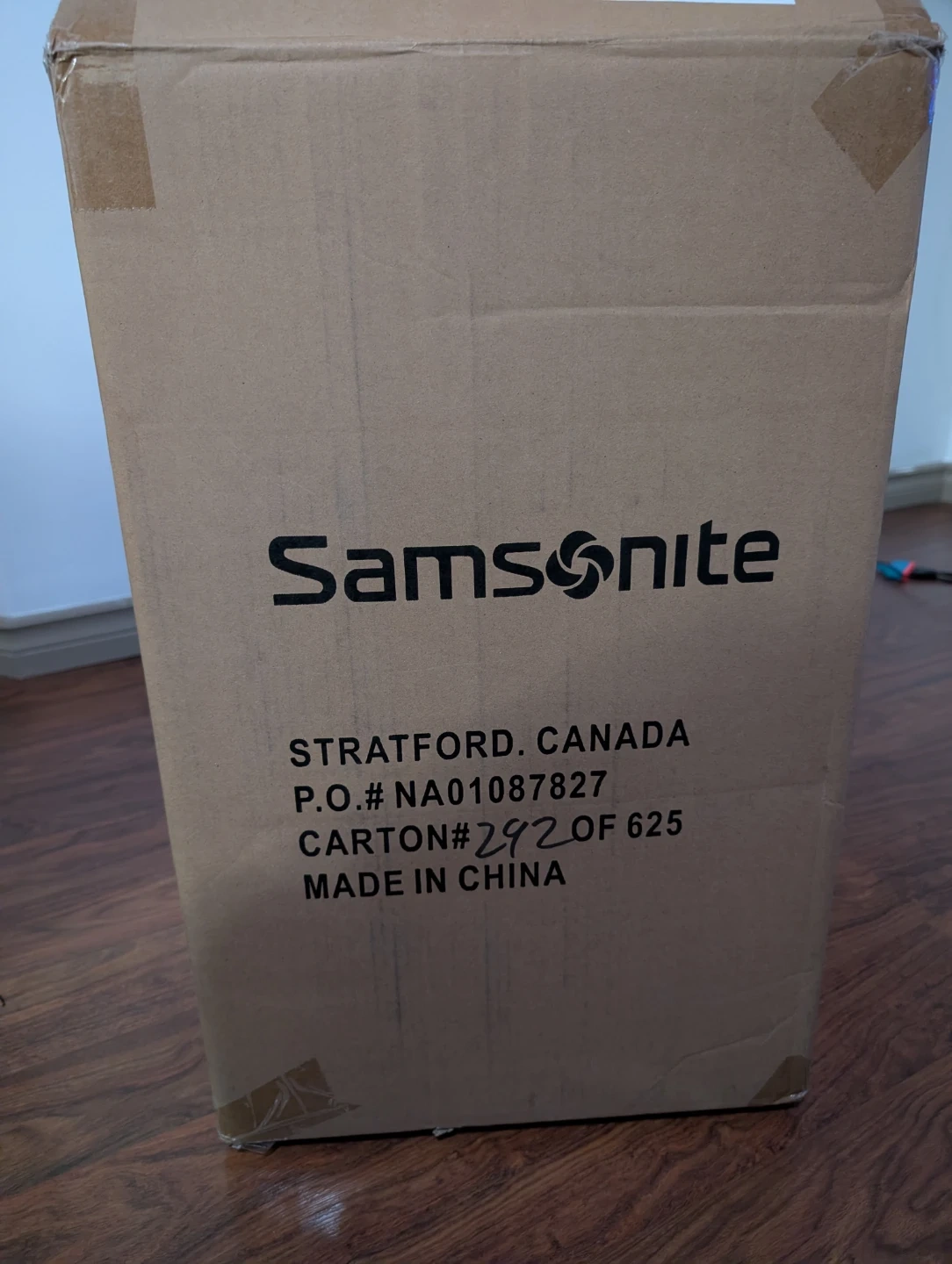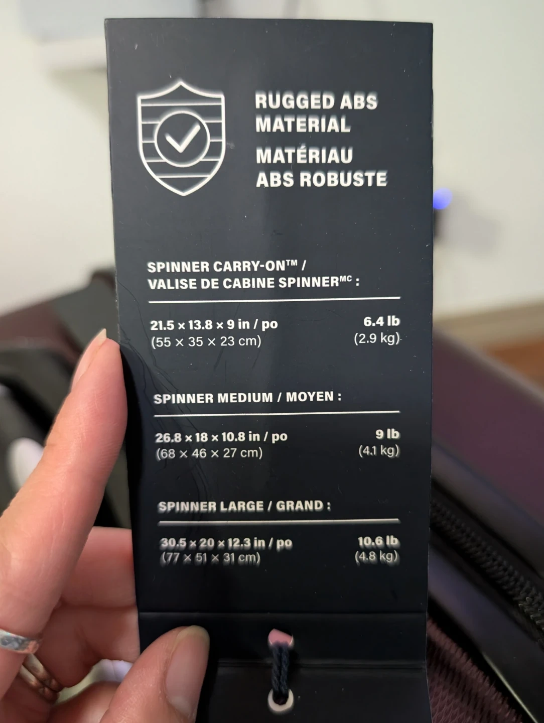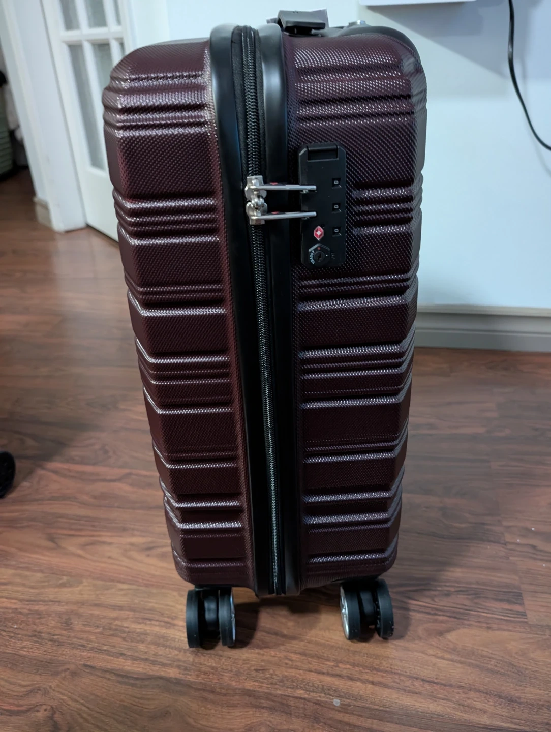 This is a Samsonite Rhapsody 360 spinner carry-on suitcase. It's made of rugged ABS material. It features dual spinner wheels, a TSA-approved lock, and an expansion zipper. The interior has a divider panel, cross-straps, and a mesh panel pocket.