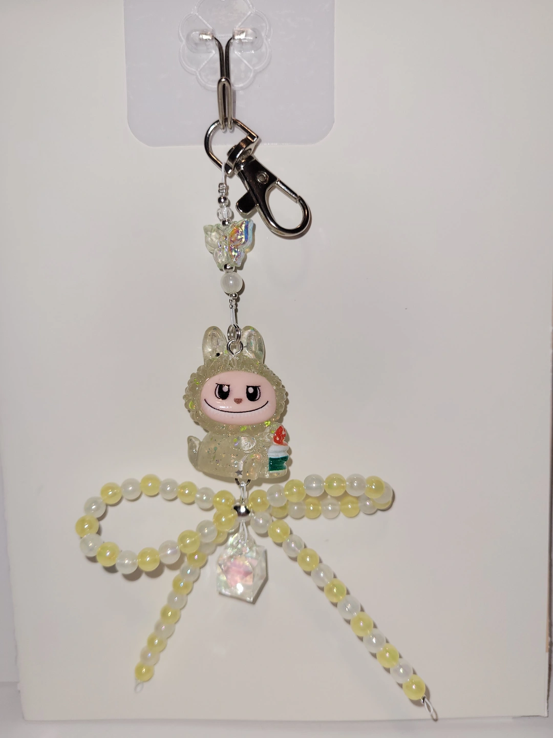 This is a super cute bunny charm keychain! It features a sparkly bunny figure, a yellow and white beaded bow, and a clear crystal charm. Perfect for adding a touch of whimsy to your keys or bag!