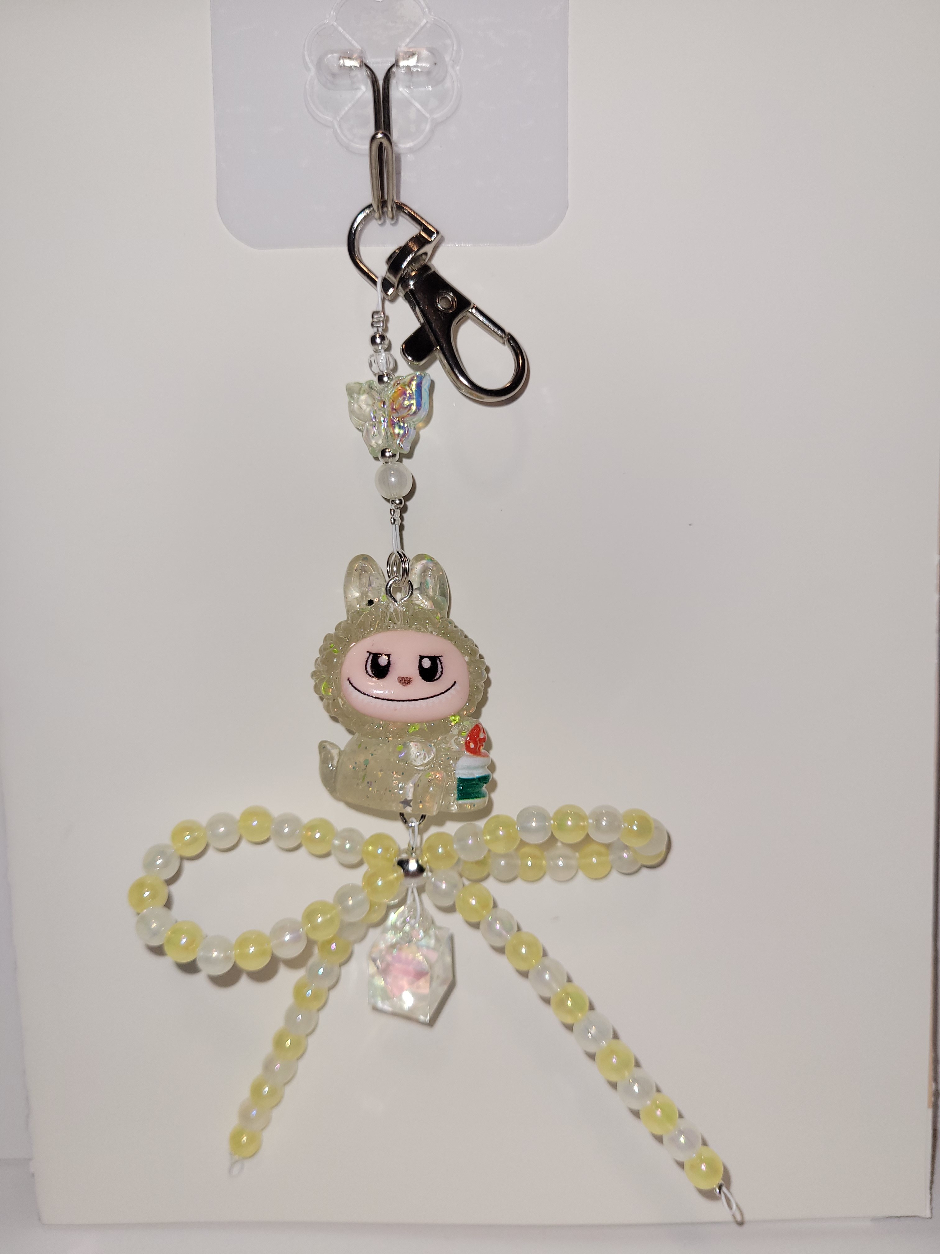 This is a super cute bunny charm keychain! It features a sparkly bunny figure, a yellow and white beaded bow, and a clear crystal charm. Perfect for adding a touch of whimsy to your keys or bag!