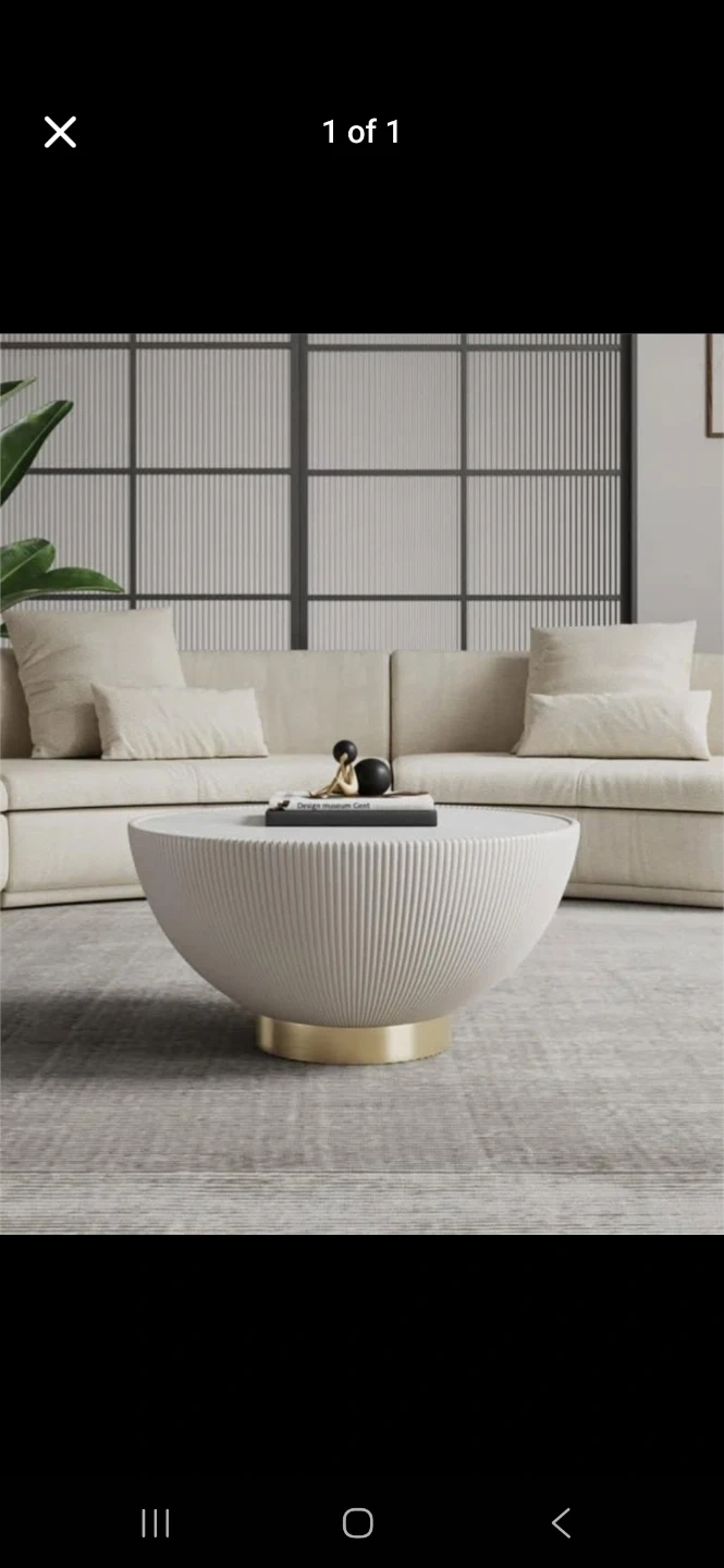 This unique coffee table features a ribbed, bowl-shaped top. It's finished with a sleek gold-toned base. This piece adds a modern touch to any living space.