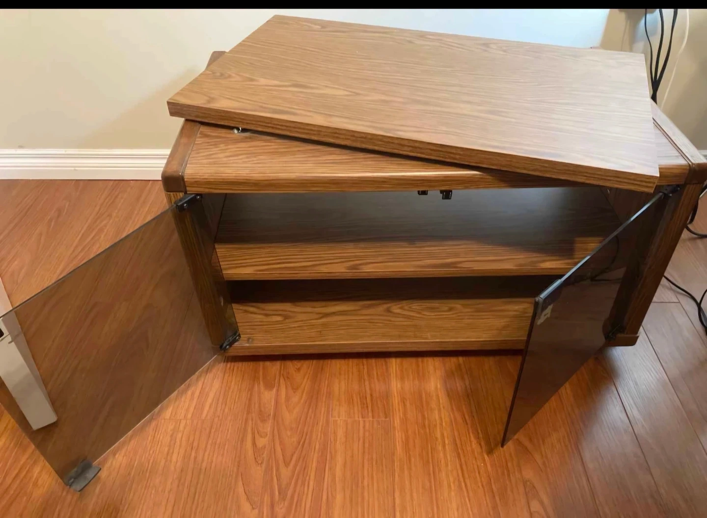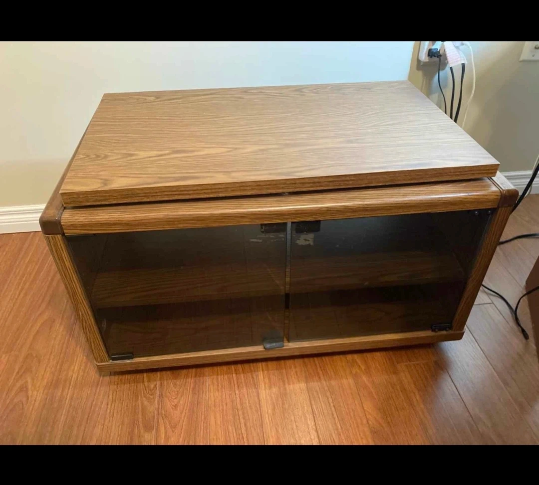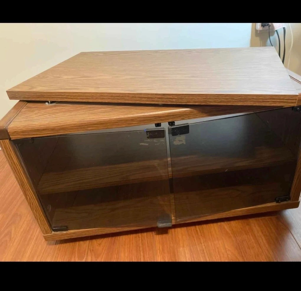 This entertainment unit has a wood grain finish and two smoked glass doors. It features two adjustable shelves inside. It's great for storing media components. Nothing wrong with it. Just down sizing